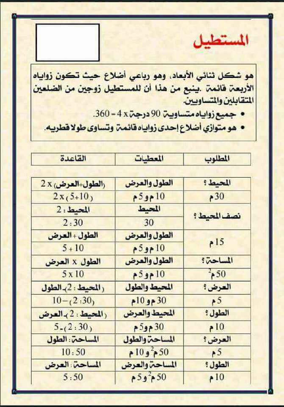 مراجعة درس المستطيل في الرياضيات 5 ابتدائي مادة الرياضيات للسنة الخامسة 5 ابتدائي دروس مفصلة ، فروض واختبارات، تمارين محلولة: ملخص دروس الرياضيات للسنة الخامسة ابتدائي