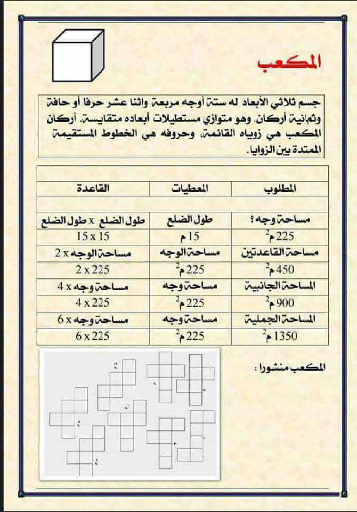 مراجعة درس المكعب في الرياضيات 5 ابتدائي مادة الرياضيات للسنة الخامسة 5 ابتدائي دروس مفصلة ، فروض واختبارات، تمارين محلولة: ملخص دروس الرياضيات للسنة الخامسة ابتدائي