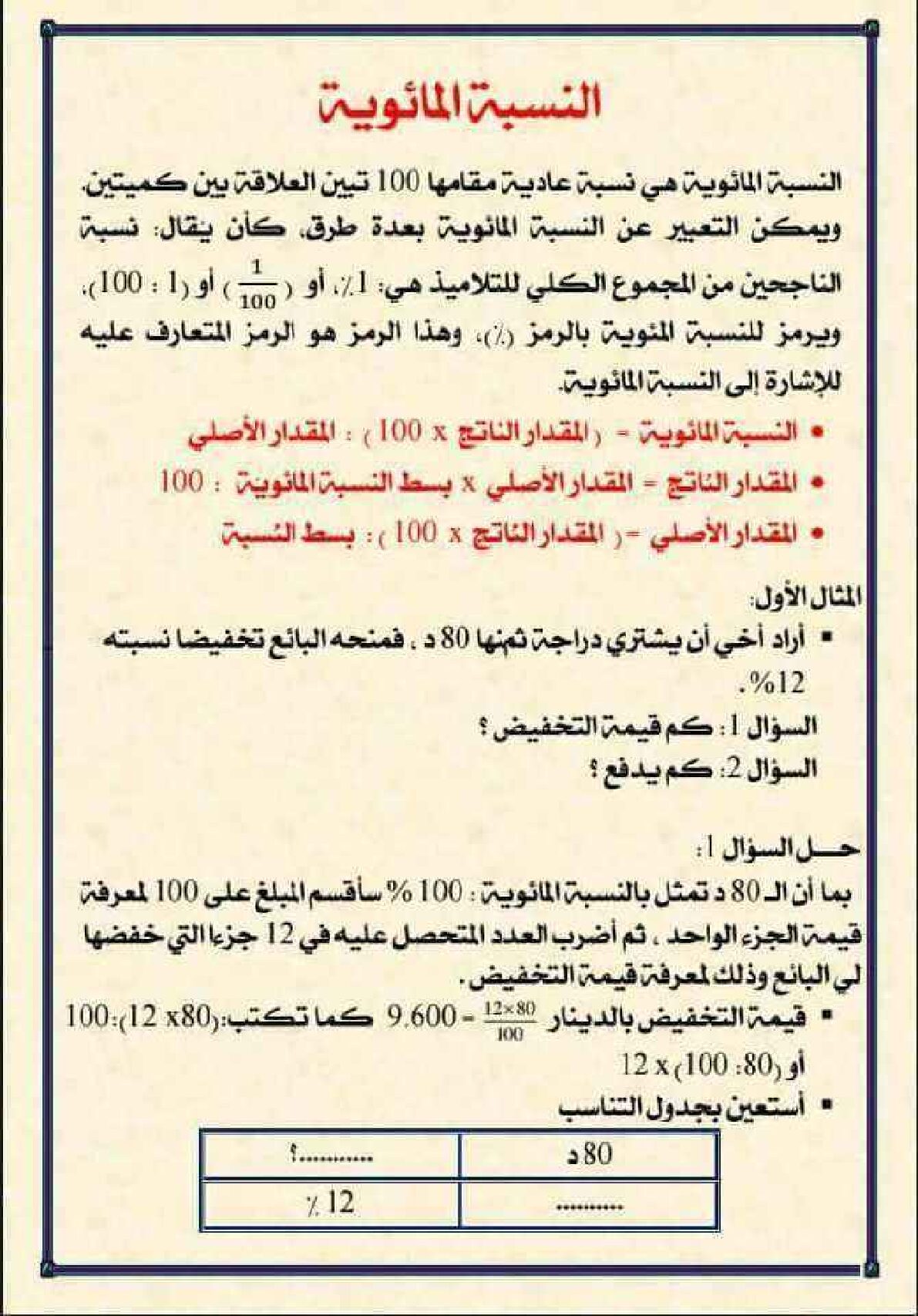 مراجعة درس النسبة المئوية في الرياضيات 5 ابتدائي مادة الرياضيات للسنة الخامسة 5 ابتدائي دروس مفصلة ، فروض واختبارات، تمارين محلولة: ملخص دروس الرياضيات للسنة الخامسة ابتدائي