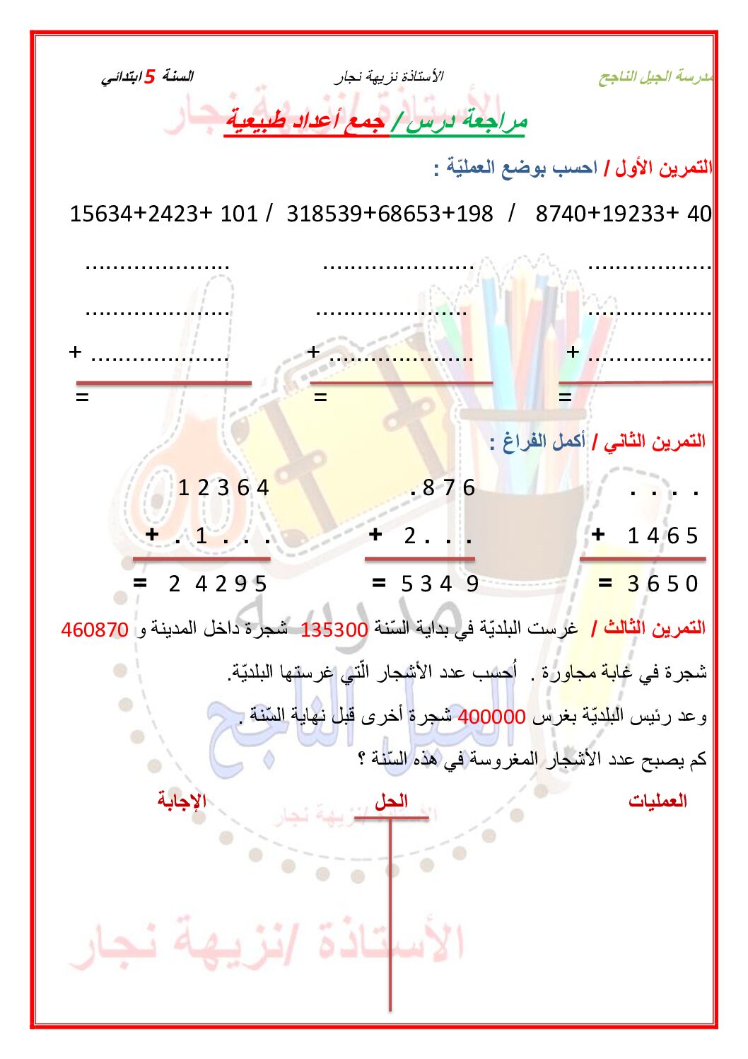 مراجعة درس جمع أعداد طبيعية للأستاذة نزيهة نجار 5 ابتدائي مادة الرياضيات للسنة الخامسة 5 ابتدائي دروس مفصلة ، فروض واختبارات، تمارين محلولة: ملخص دروس الرياضيات للسنة الخامسة ابتدائي