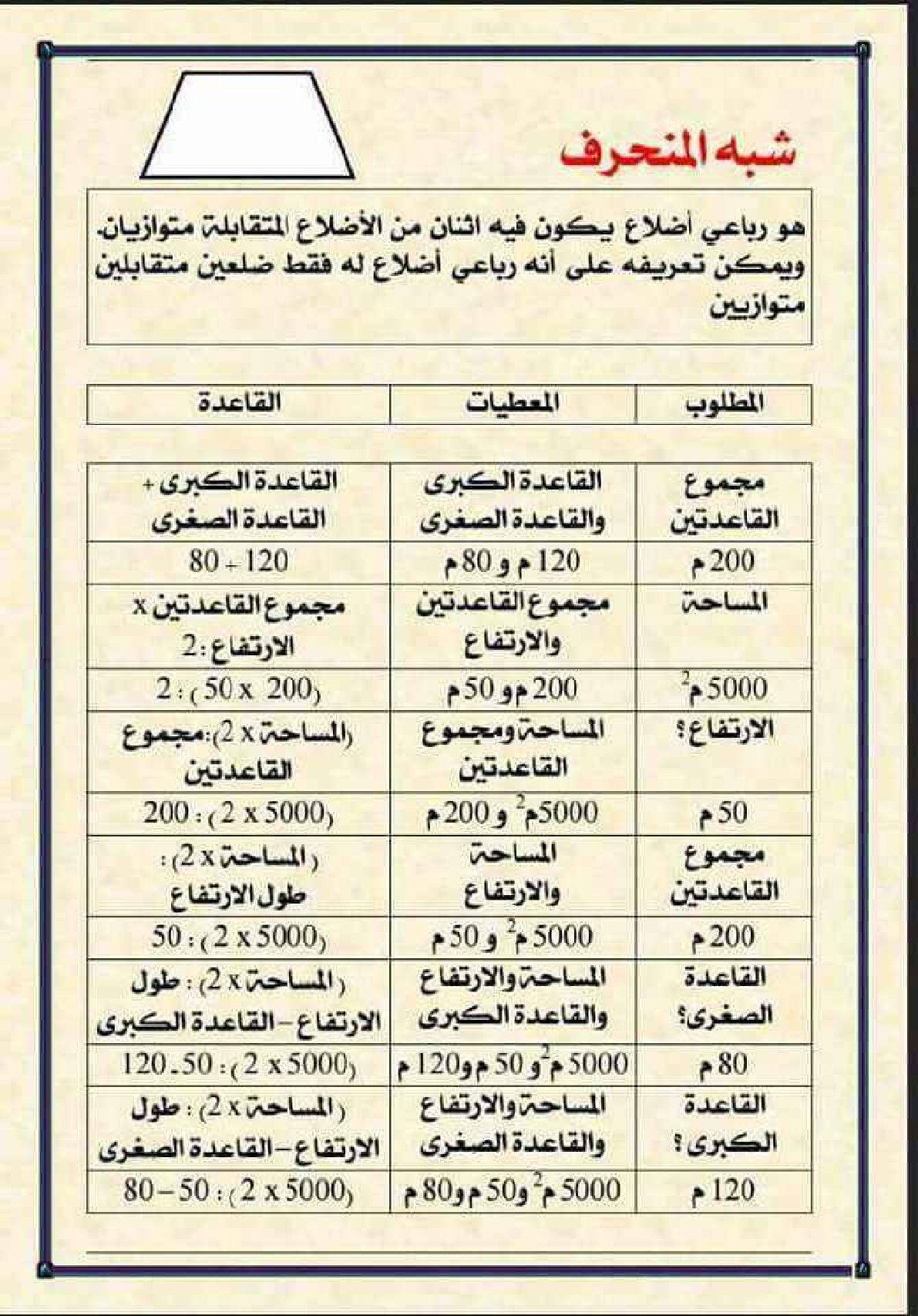 مراجعة درس شبه المنحرف في الرياضيات 5 ابتدائي مادة الرياضيات للسنة الخامسة 5 ابتدائي دروس مفصلة ، فروض واختبارات، تمارين محلولة: ملخص دروس الرياضيات للسنة الخامسة ابتدائي