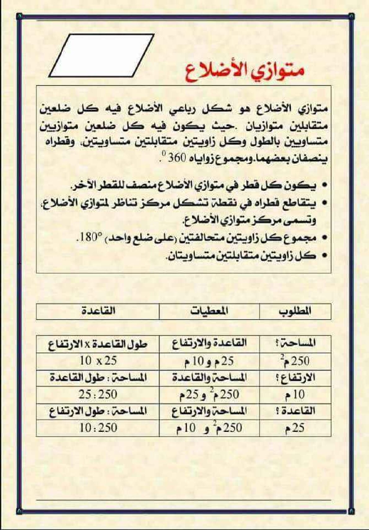 مراجعة درس متوازي الأضلاع في الرياضيات 5 ابتدائي مادة الرياضيات للسنة الخامسة 5 ابتدائي دروس مفصلة ، فروض واختبارات، تمارين محلولة: ملخص دروس الرياضيات للسنة الخامسة ابتدائي