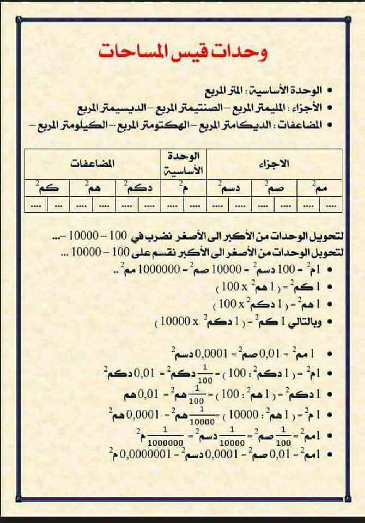 مراجعة درس وحدات قياس المساحات في الرياضيات 5 ابتدائي مادة الرياضيات للسنة الخامسة 5 ابتدائي دروس مفصلة ، فروض واختبارات، تمارين محلولة: ملخص دروس الرياضيات للسنة الخامسة ابتدائي
