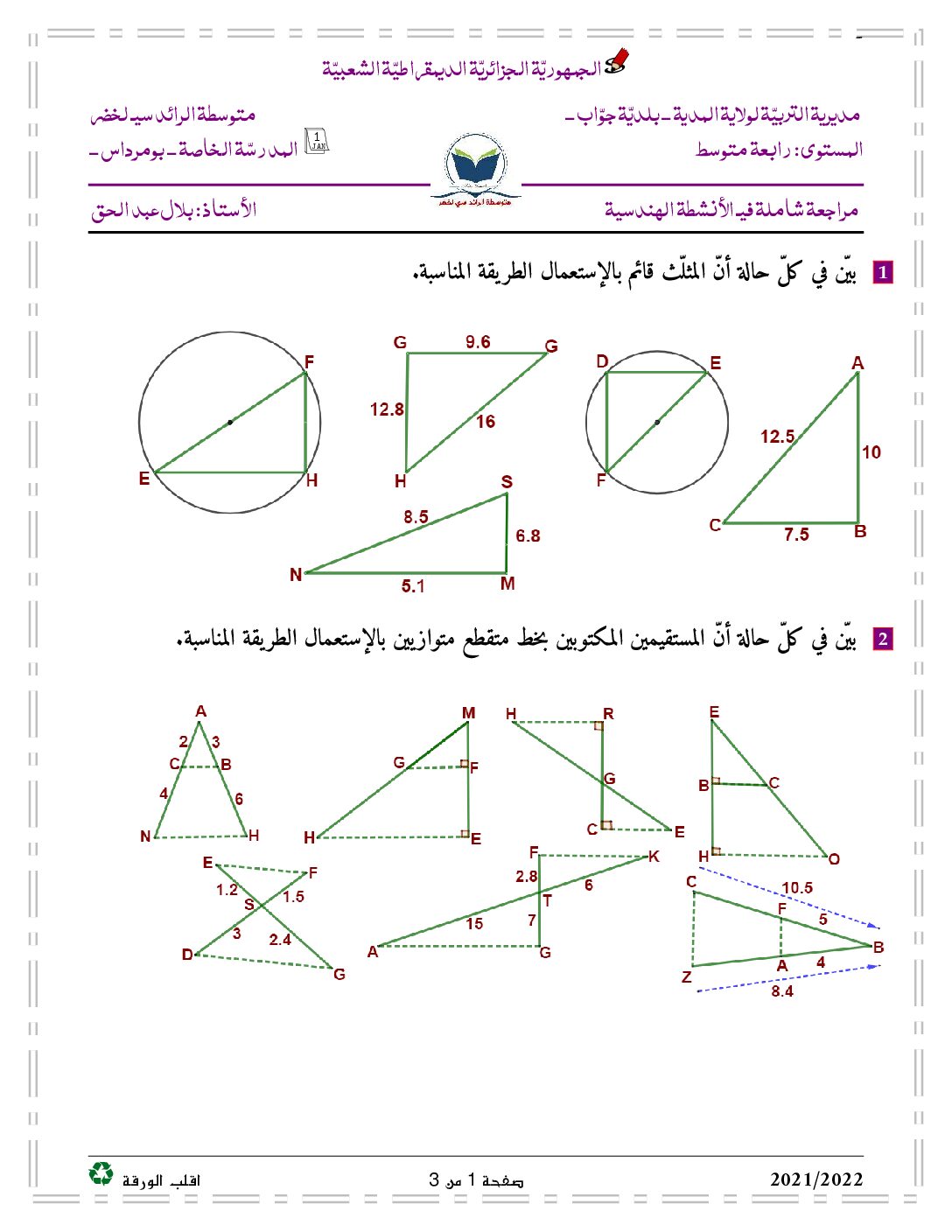 مراجعة شاملة في الأنشطة الهندسية إعداد الأستاذ بلال عبد الحق 4 متوسط أهم الخواص التي تساعد على البرهان في الهندسة 4 متوسط مادة الرياضيات للسنة الرابعة 4 متوسط : ملخص لدروس الرياضيات سنة رابعة متوسط maths 4AM: ملفات تعليمية في مادة الرياضيات لتحضير شهادة التعليم المتوسط