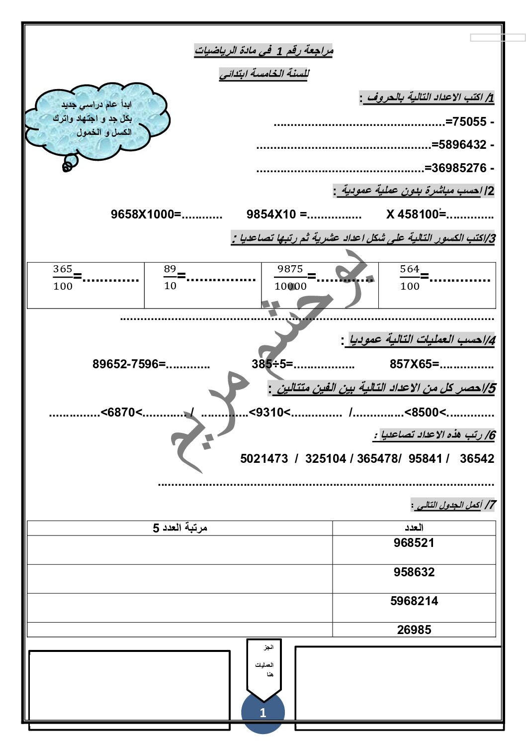 مراجعة في مادة الرياضيات الفصل الأول للأستاذة بوخشم مريم 5 ابتدائي وضعية شاملة في الرياضيات رقم 02 مع الحل للأستاذة مريم بوخشم 5 ابتدائي مادة الرياضيات للسنة الخامسة 5 ابتدائي دروس مفصلة ، فروض واختبارات، تمارين محلولة: ملخص دروس الرياضيات للسنة الخامسة ابتدائي