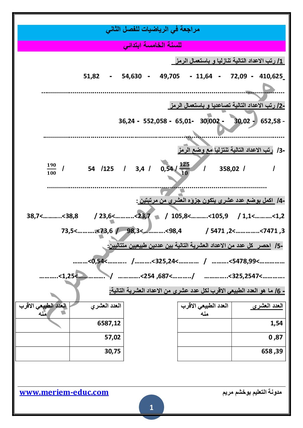 مراجعة في مادة الرياضيات الفصل الثاني للأستاذة بوخشم مريم 5 ابتدائي وضعية شاملة في الرياضيات رقم 02 مع الحل للأستاذة مريم بوخشم 5 ابتدائي مادة الرياضيات للسنة الخامسة 5 ابتدائي دروس مفصلة ، فروض واختبارات، تمارين محلولة: ملخص دروس الرياضيات للسنة الخامسة ابتدائي