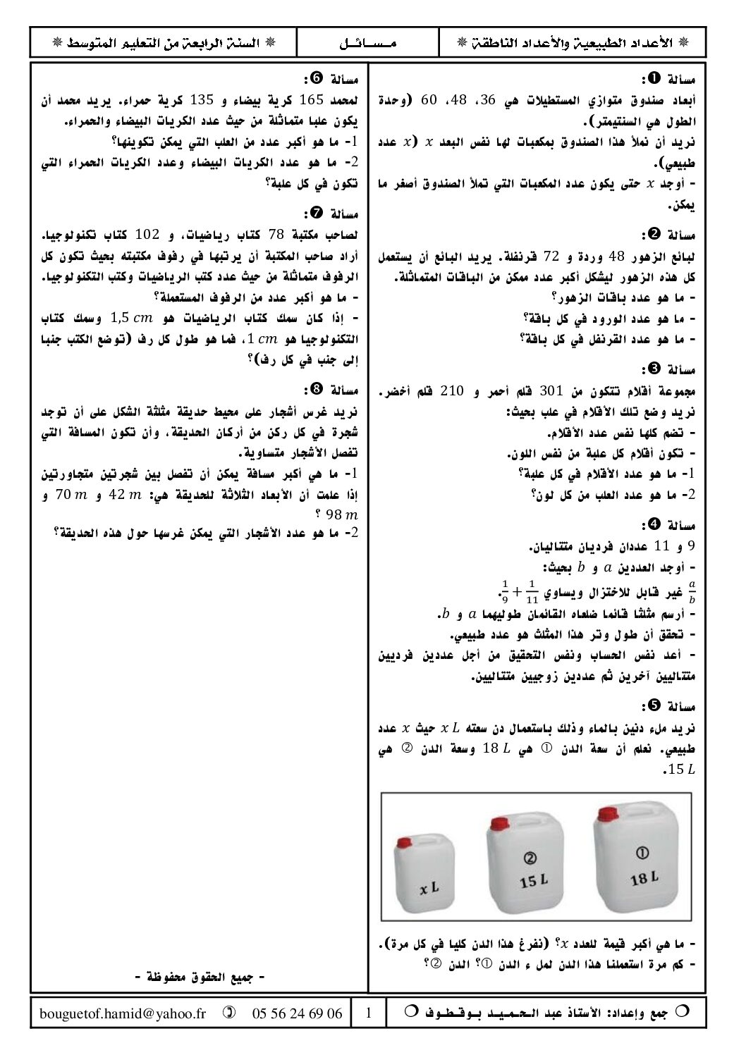 مسائل حول الأعداد الطبيعية و الأعداد الناطقة إعداد الأستاذ عبد الحميد بوقطوف 4 متوسط 14 سؤال و جواب حول الدالة الخطية و الدالة التالفية في الرياضيات 4 متوسط : سلاسل تمارين وتطبيقات محلولة في الرياضيات سنة رابعة متوسط maths 4AM: ملفات تعليمية في مادة الرياضيات لتحضير شهادة التعليم المتوسط