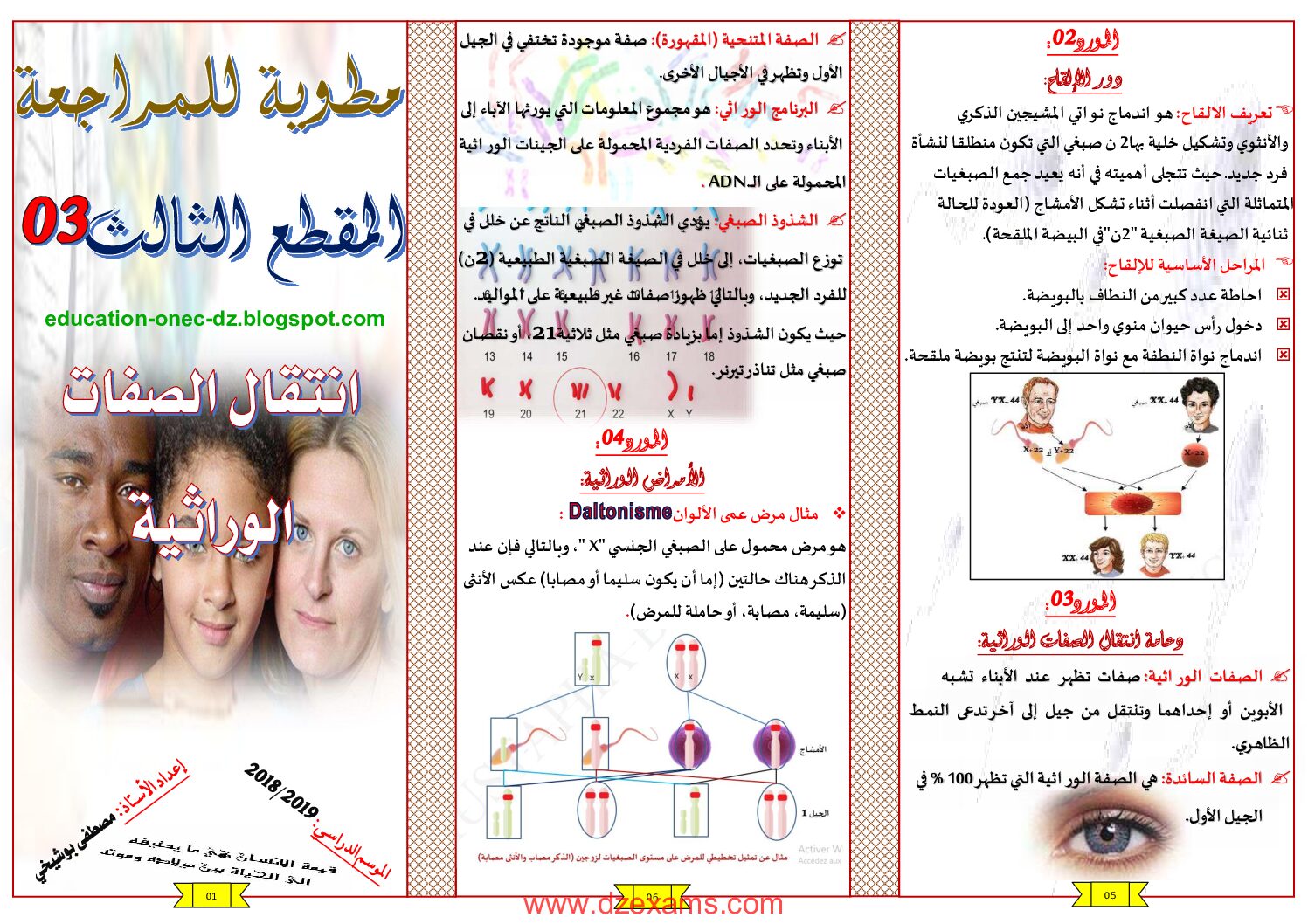 مطوية انتقال الصفات الوراثية من إعداد الاستاذ مصطفى بوشيخي 4 متوسط منهجية العلوم الطبيعية من متوسطة الشهيد ضبابي اقويدر 4 متوسط مادة العلوم الطبيعية للسنة الرابعة 4 متوسط دروس مفصلة، فروض واختبارات، تمارين محلولة: