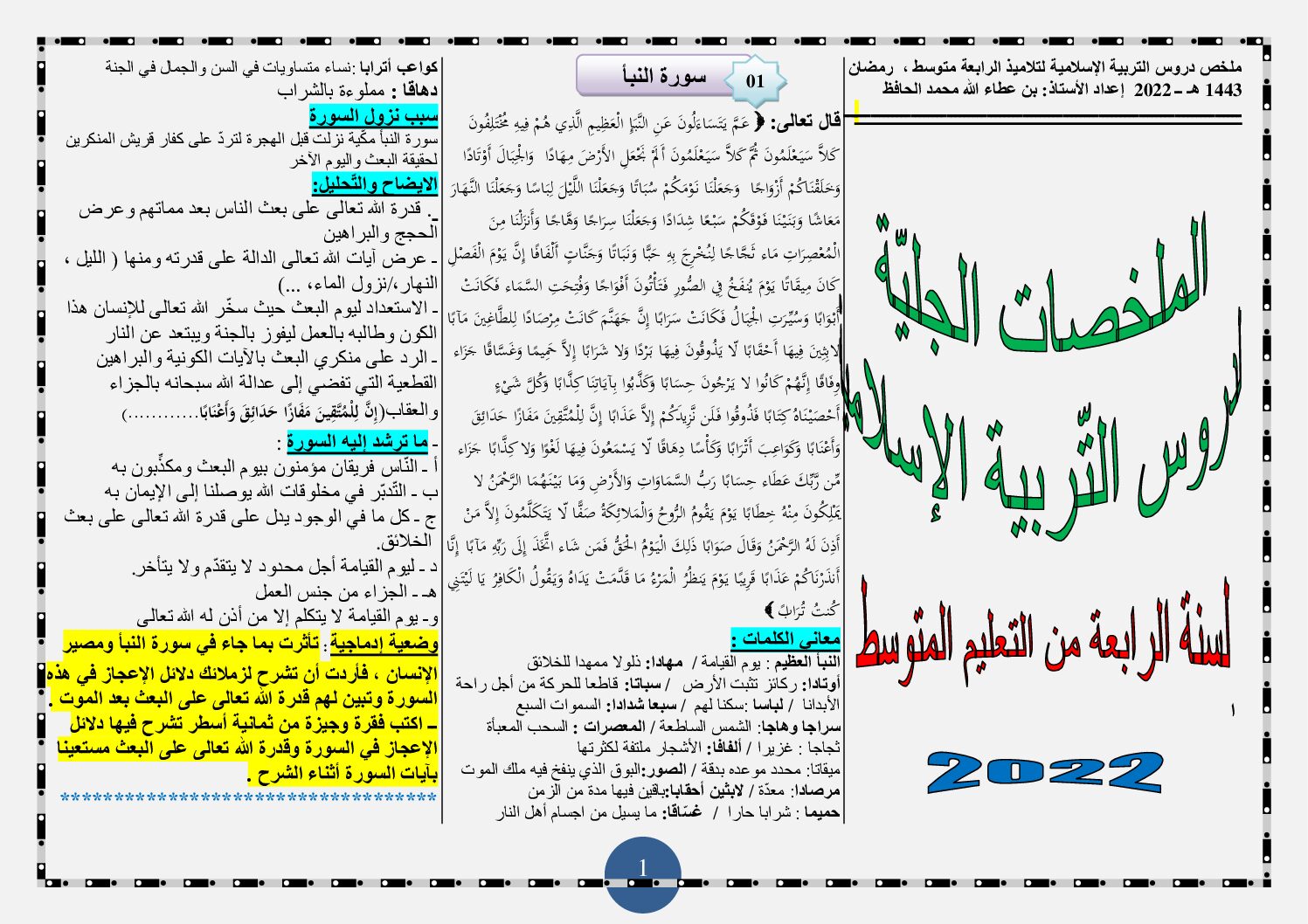 ملخصات التربية اللإسلامية كاملة 4 متوسط مادة التربية الإسلامية للسنة الرابعة 4 متوسط دروس مفصلة، فروض واختبارات، تمارين محلولة: المراجعات السنية لدروس التربية الإسلامية 4 متوسط