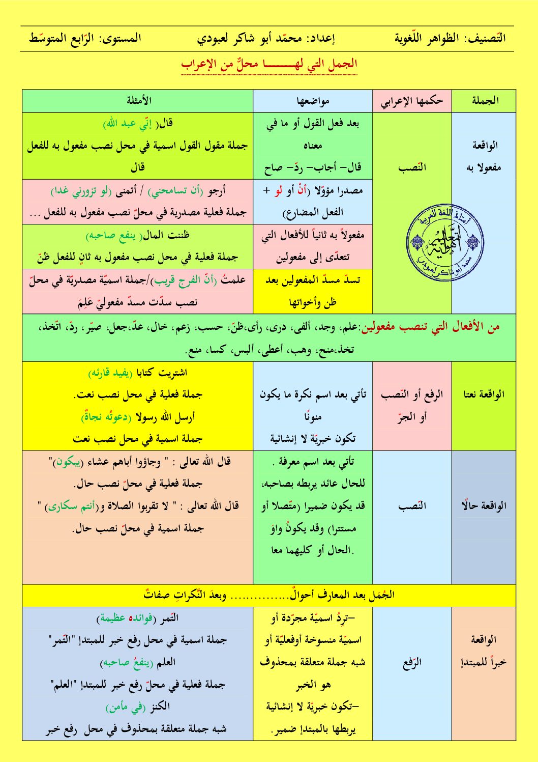 ملخص الجمل التي لها محل من الاعراب للأستاذ محمد أبو شاكر لعبودي 4 متوسط استراتيجية الاجابة عن أسئلة مادة اللغة العربية 4 متوسط مادة اللغة العربية للسنة الرابعة 4 متوسط دروس مفصلة، فروض واختبارات، تمارين محلولة