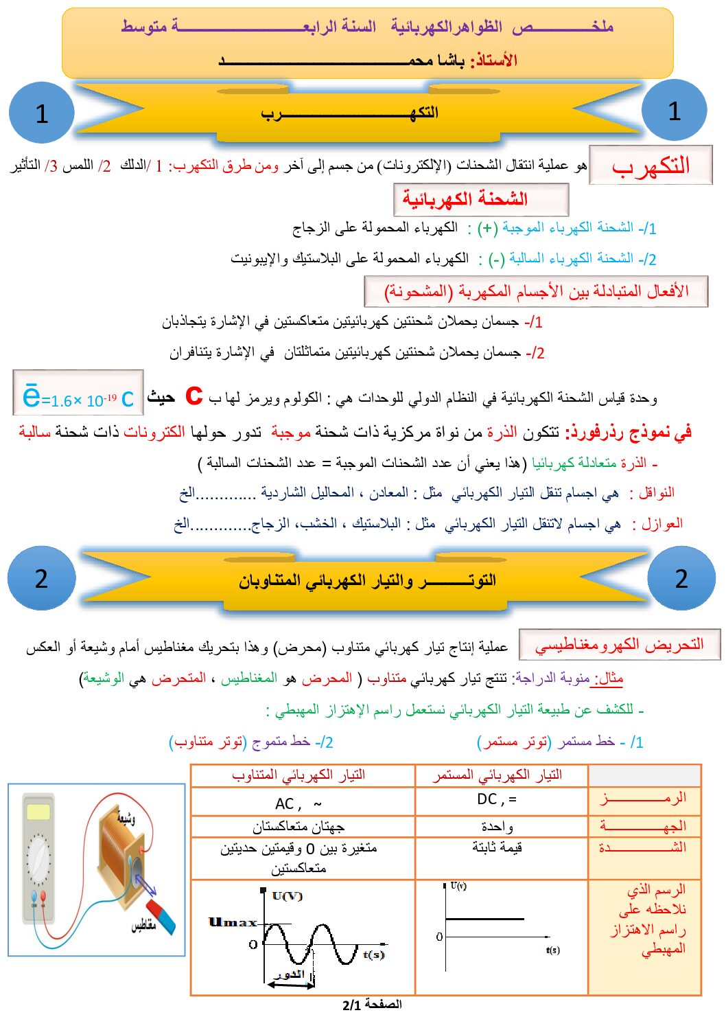 ملخص الظواهر الكهربائية فيزياء للاستاذ باشا محمد 4 متوسط