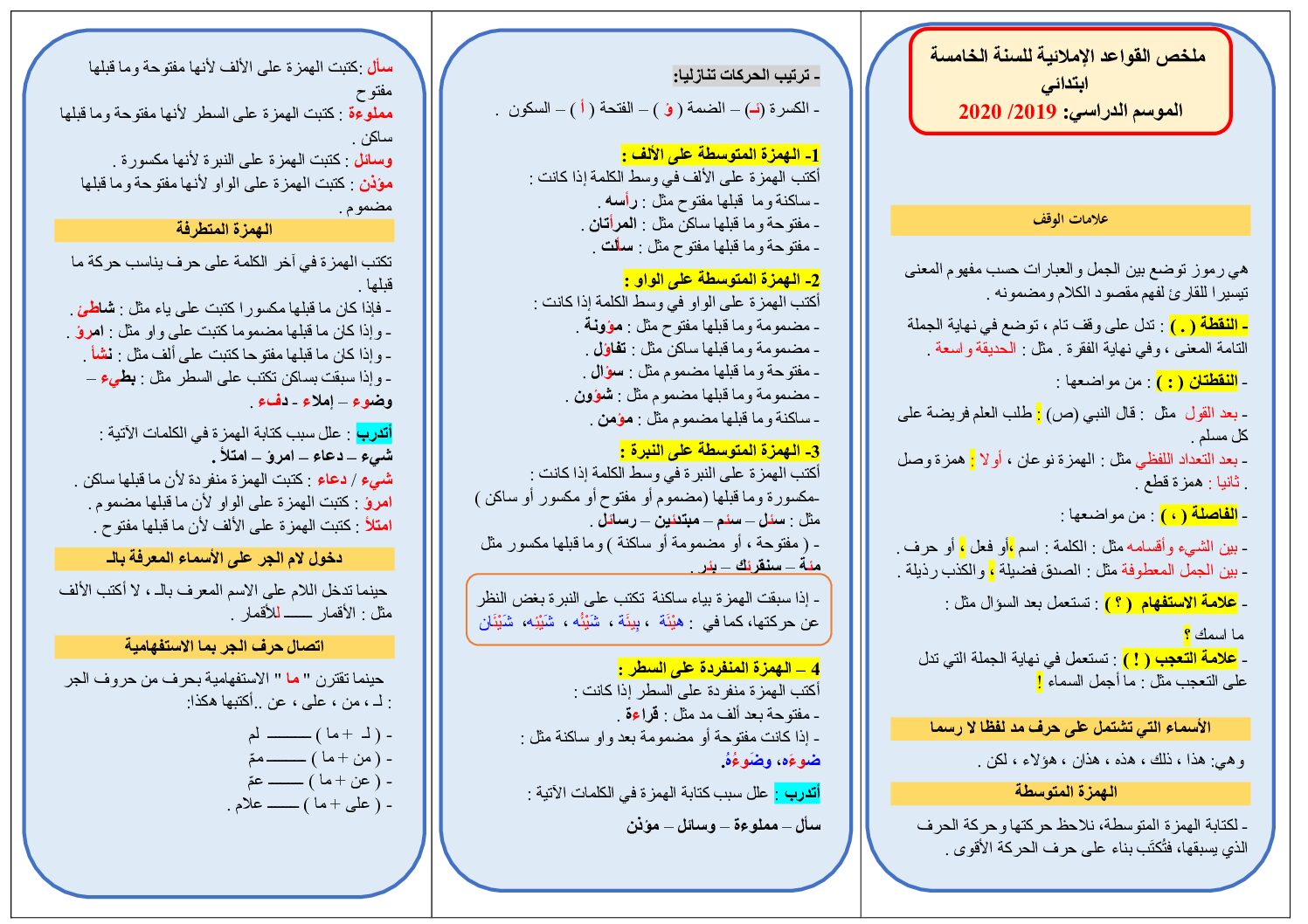 ملخص تاج الوفاء للقواعد الإملائية في اللغة العربية 5 ابتدائي