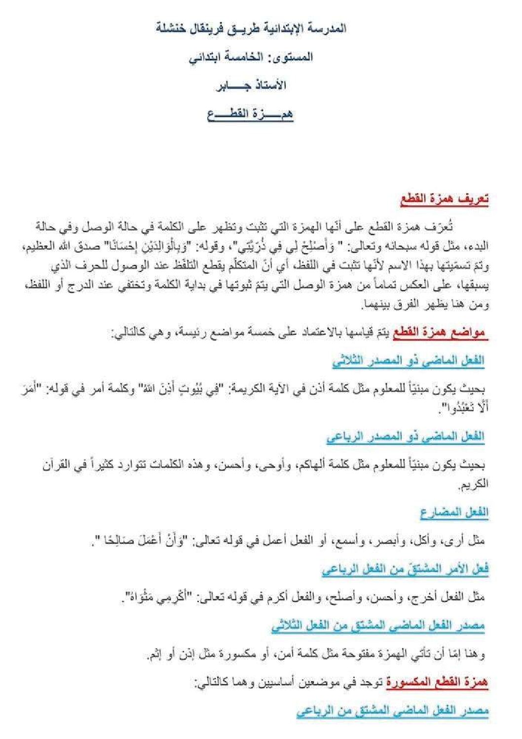 ملخص درس همزة القطع للأستاذ جابر 5 ابتدائي مادة اللغة العربية للسنة الخامسة 5 ابتدائي دروس مفصلة ، فروض واختبارات، تمارين محلولة: تقويم تشخيصي في اللغة العربية سنة خامسة ابتدائي