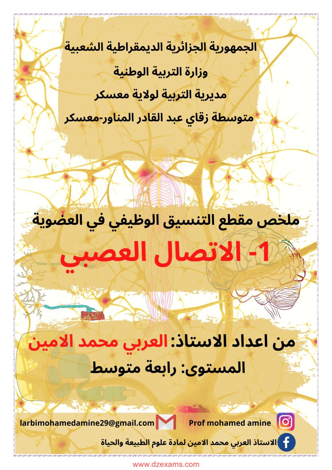 ملخص دروس الاتصال العصبي للاستاذ العربي محمد الامين 4 متوسط منهجية العلوم الطبيعية من متوسطة الشهيد ضبابي اقويدر 4 متوسط مادة العلوم الطبيعية للسنة الرابعة 4 متوسط دروس مفصلة، فروض واختبارات، تمارين محلولة: