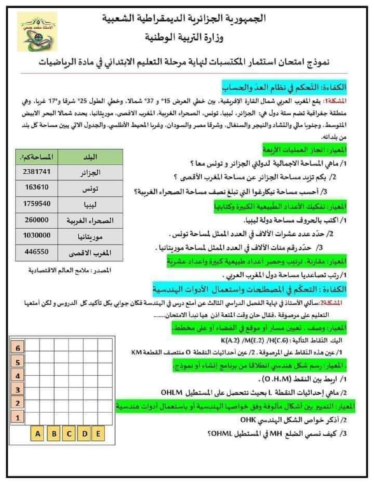 مادة الرياضيات للسنة الخامسة 5 ابتدائي دروس مفصلة، فروض واختبارات، تمارين محلولة : نموذج لإمتحان تقييم المكتسبات رقم 2- في مادة الرياضيات مستوى السنة الخامسة ابتدائي الجيل الثاني ، السنة الدراسية: 2026/2027 مع التصحيح