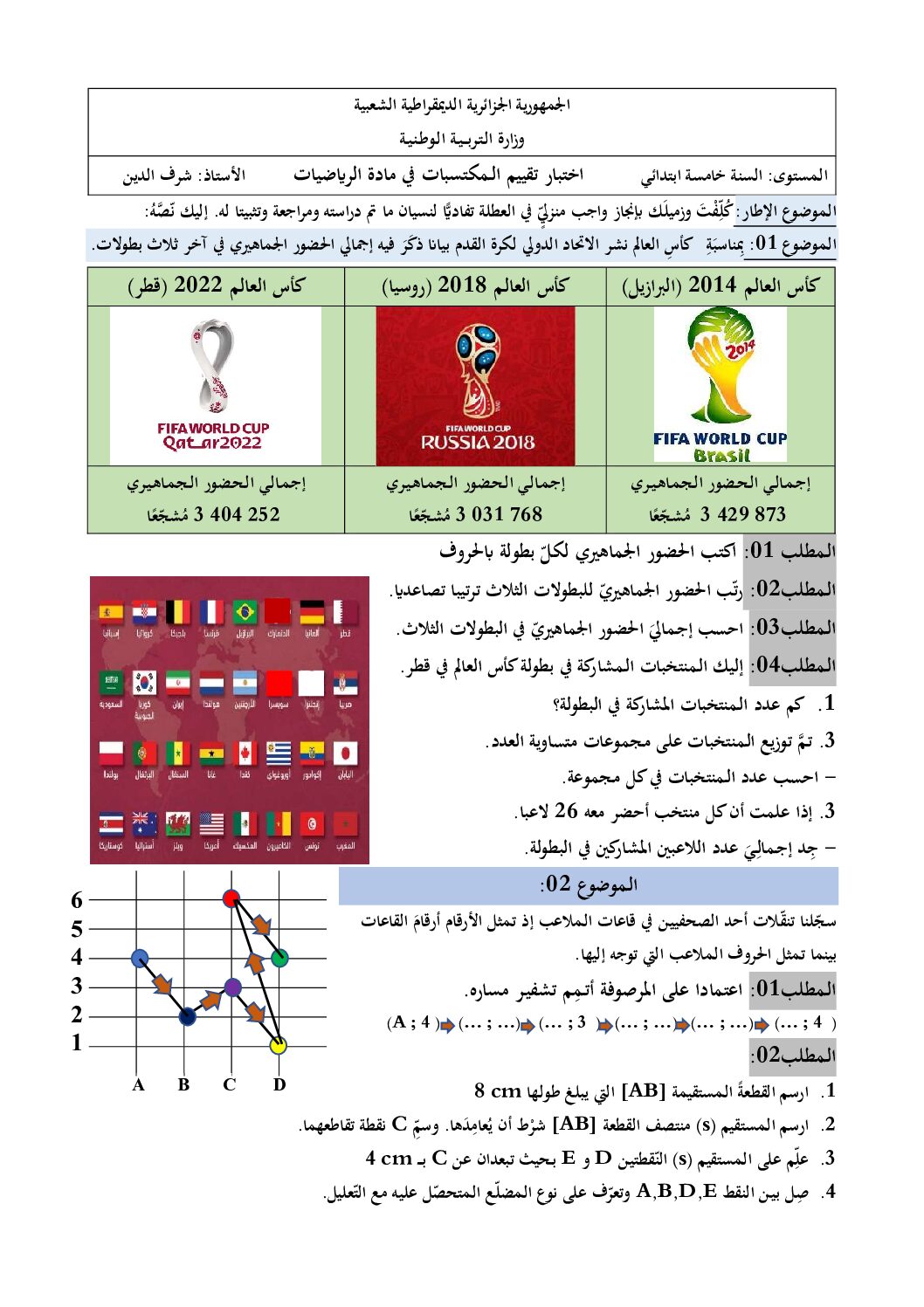 مادة الرياضيات للسنة الخامسة 5 ابتدائي دروس مفصلة، فروض واختبارات، تمارين محلولة : نموذج لإمتحان تقييم المكتسبات رقم 3- في مادة الرياضيات مستوى السنة الخامسة ابتدائي الجيل الثاني ، السنة الدراسية: 2026/2027 مع التصحيح