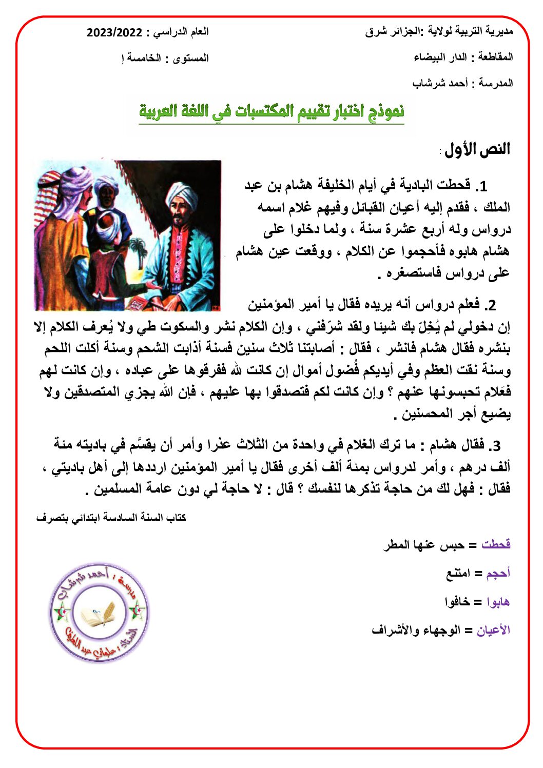 مادة اللغة العربية للسنة الخامسة 5 ابتدائي دروس مفصلة، فروض واختبارات، تمارين محلولة : نموذج لإمتحان تقييم المكتسبات رقم 16- في مادة اللغة العربية مستوى السنة الخامسة ابتدائي الجيل الثاني ، السنة الدراسية: 2026/2027 مع التصحيح