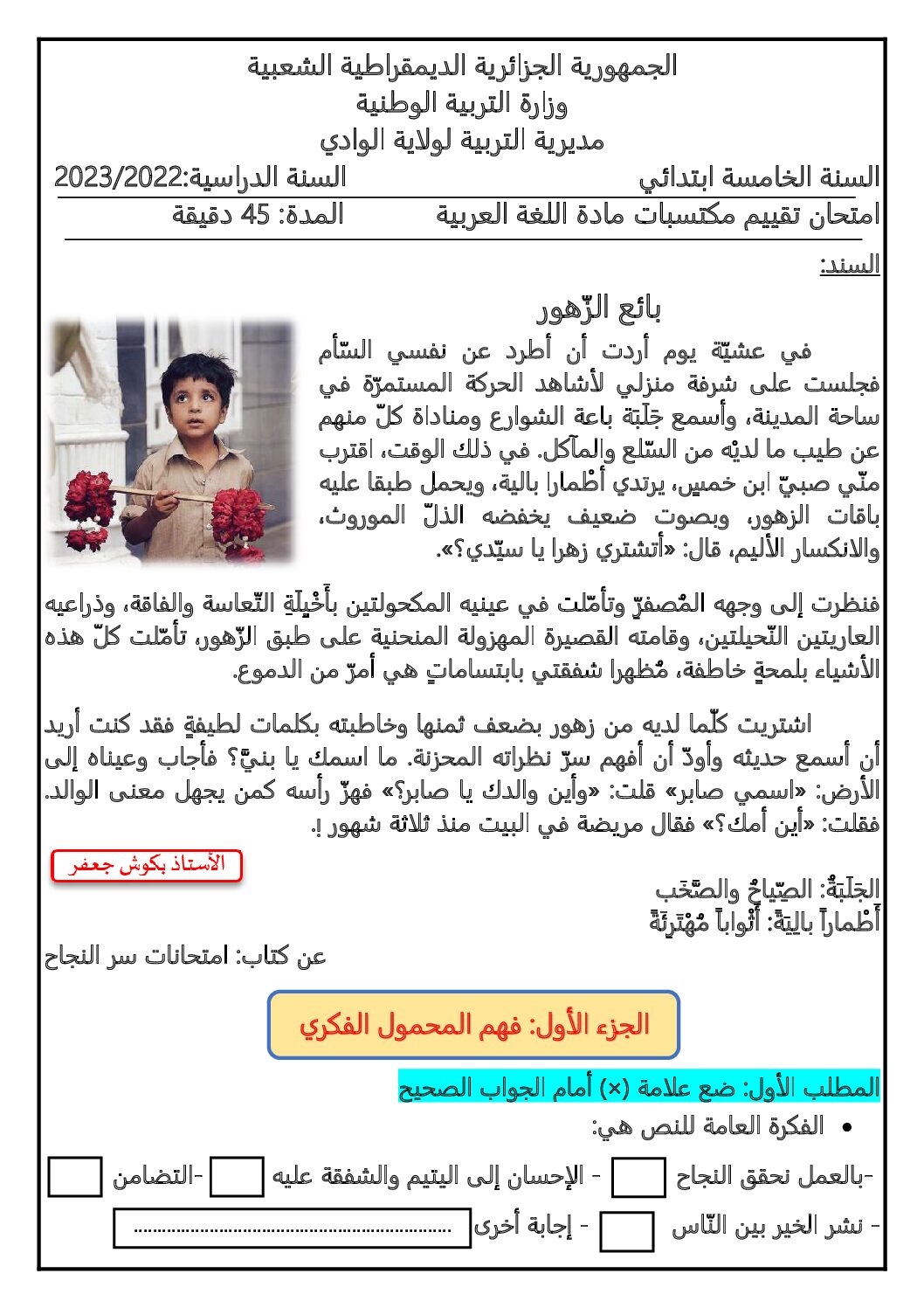 مادة اللغة العربية للسنة الخامسة 5 ابتدائي دروس مفصلة، فروض واختبارات، تمارين محلولة : نموذج لإمتحان تقييم المكتسبات رقم 17- في مادة اللغة العربية مستوى السنة الخامسة ابتدائي الجيل الثاني ، السنة الدراسية: 2026/2027 مع التصحيح