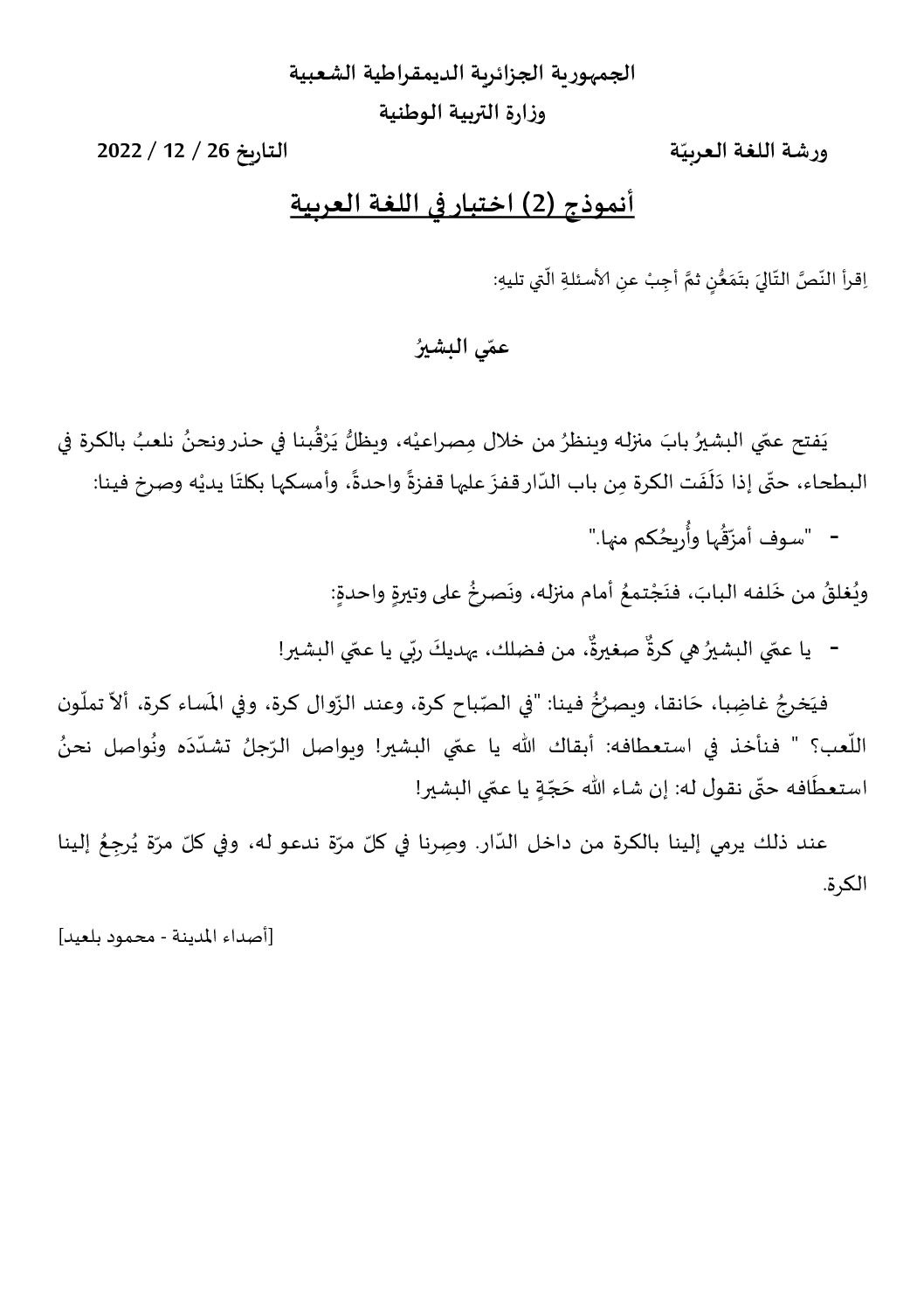 نموذج امتحان تقييم المكتسبات في اللغة العربية السنة الخامسة ابتدائي رقم 7