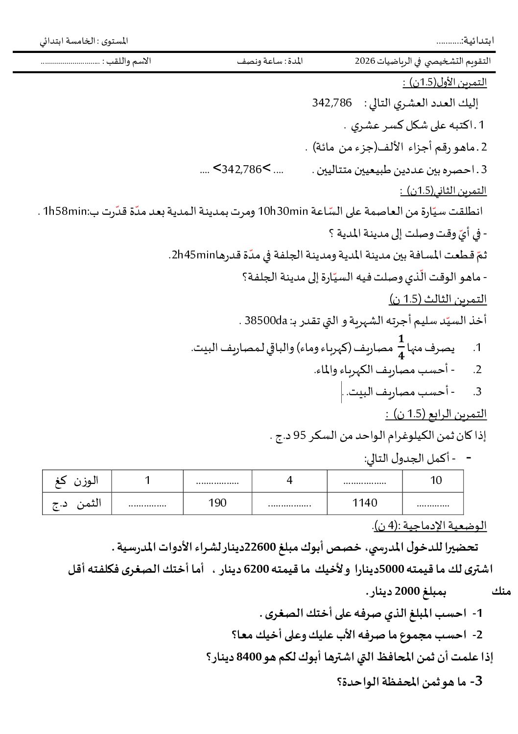 مادة الرياضيات للسنة الخامسة 5 ابتدائي دروس مفصلة، فروض واختبارات، تمارين محلولة : نموذج لإمتحان تقويم تشخيصي رقم 18- في مادة الرياضيات مستوى السنة الخامسة ابتدائي الجيل الثاني ، السنة الدراسية: 2026/2027 مع التصحيح