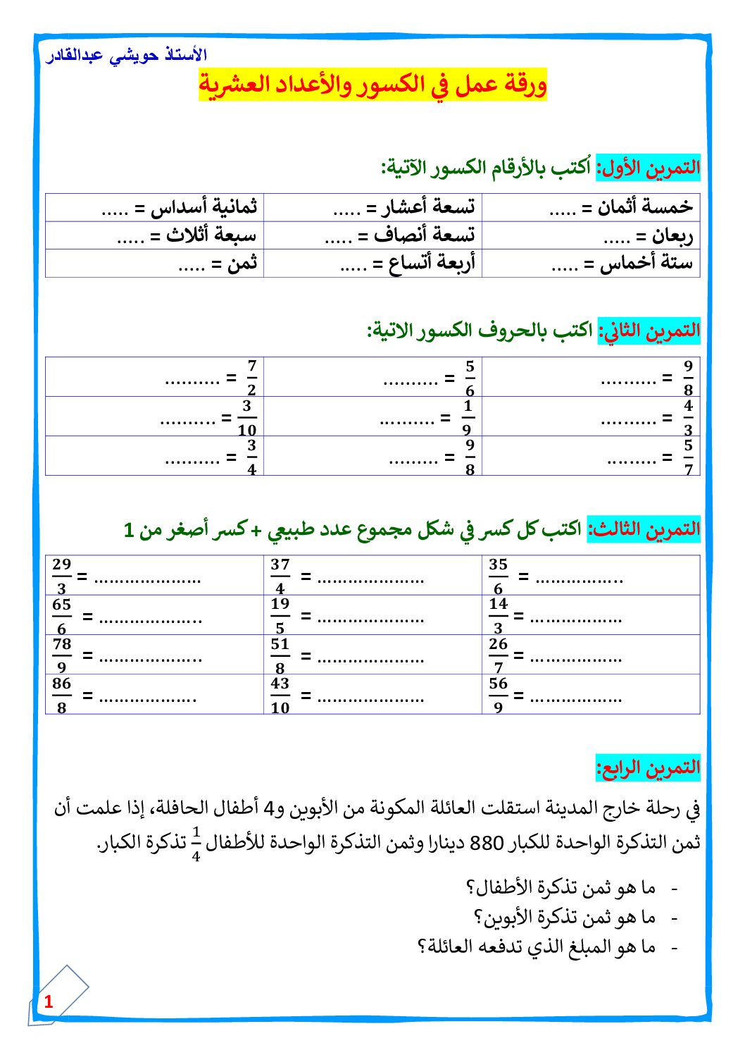 ورقة عمل في الكسور والاعداد العشرية مع الحل للاستاذ حويشي عبد القادر 5 ابتدائي وضعية شاملة في الرياضيات رقم 02 مع الحل للأستاذة مريم بوخشم 5 ابتدائي مادة الرياضيات للسنة الخامسة 5 ابتدائي دروس مفصلة ، فروض واختبارات، تمارين محلولة: ملخص دروس الرياضيات للسنة الخامسة ابتدائي
