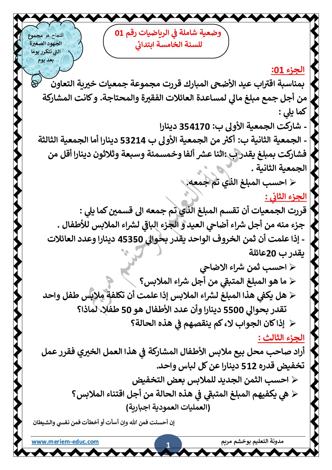 وضعية شاملة في الرياضيات رقم 01 مع الحل للأستاذة مريم بوخشم 5 ابتدائي وضعية شاملة في الرياضيات رقم 02 مع الحل للأستاذة مريم بوخشم 5 ابتدائي مادة الرياضيات للسنة الخامسة 5 ابتدائي دروس مفصلة ، فروض واختبارات، تمارين محلولة: ملخص دروس الرياضيات للسنة الخامسة ابتدائي