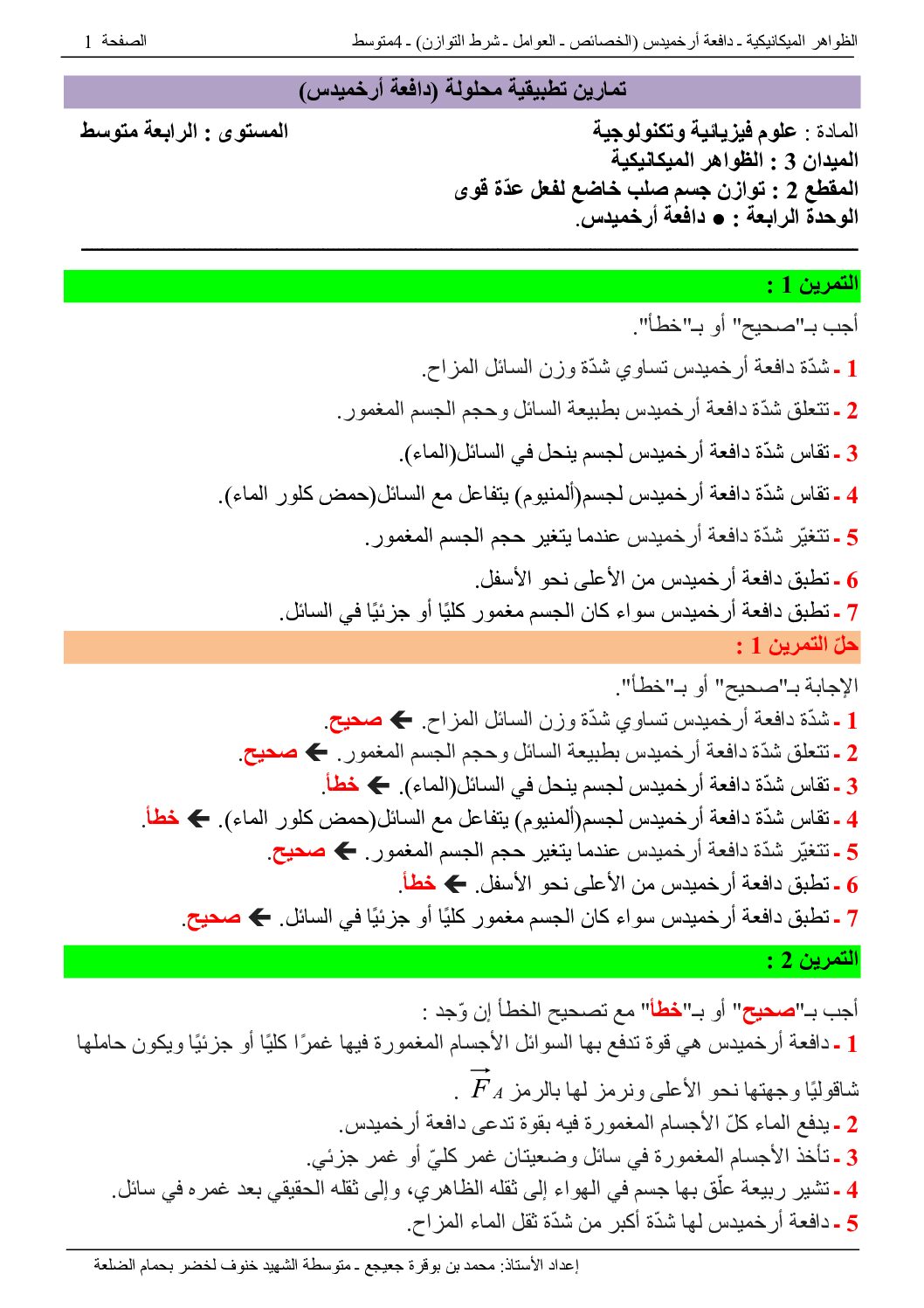 30 تمرين ومسألة مع الحل النموذجي حول دافعة أرخميدس 4 متوسط