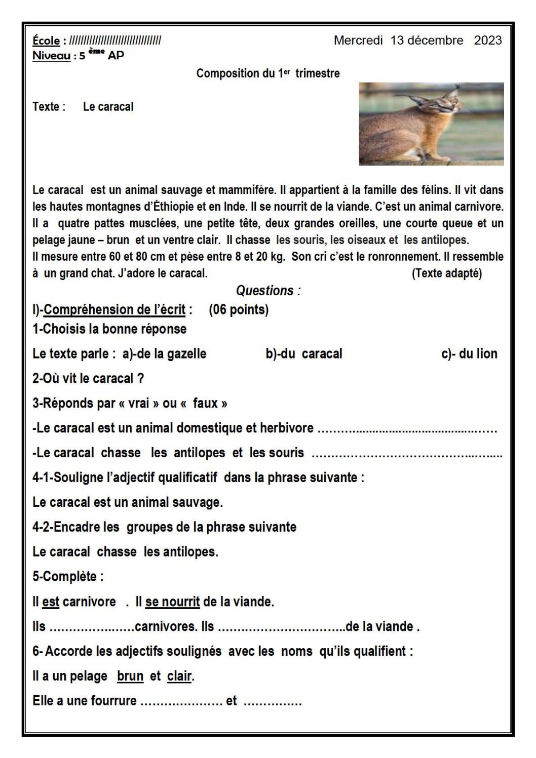 مادة اللغة الفرنسية للسنة الخامسة ابتدائي : نموذج لإمتحان في الفصل الأول رقم 138- في مادة اللغة الفرنسية مستوى السنة الخامسة ابتدائي الجيل الثاني ، السنة الدراسية: 2025/2026 مع التصحيح يمكن تصفح الإختبار مباشرة عبر موقع الدراسة الجزائري أو تحميله مباشرة بصيغة PDF بالضغط أعلاه على: .: تحميل :. اللغة الفرنسية السنة الخامسة ابتدائي