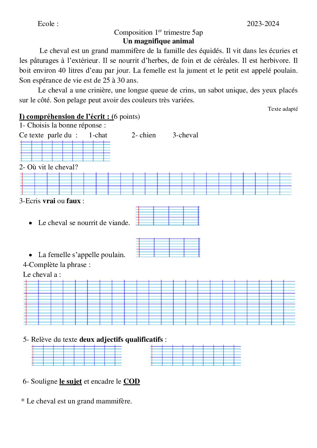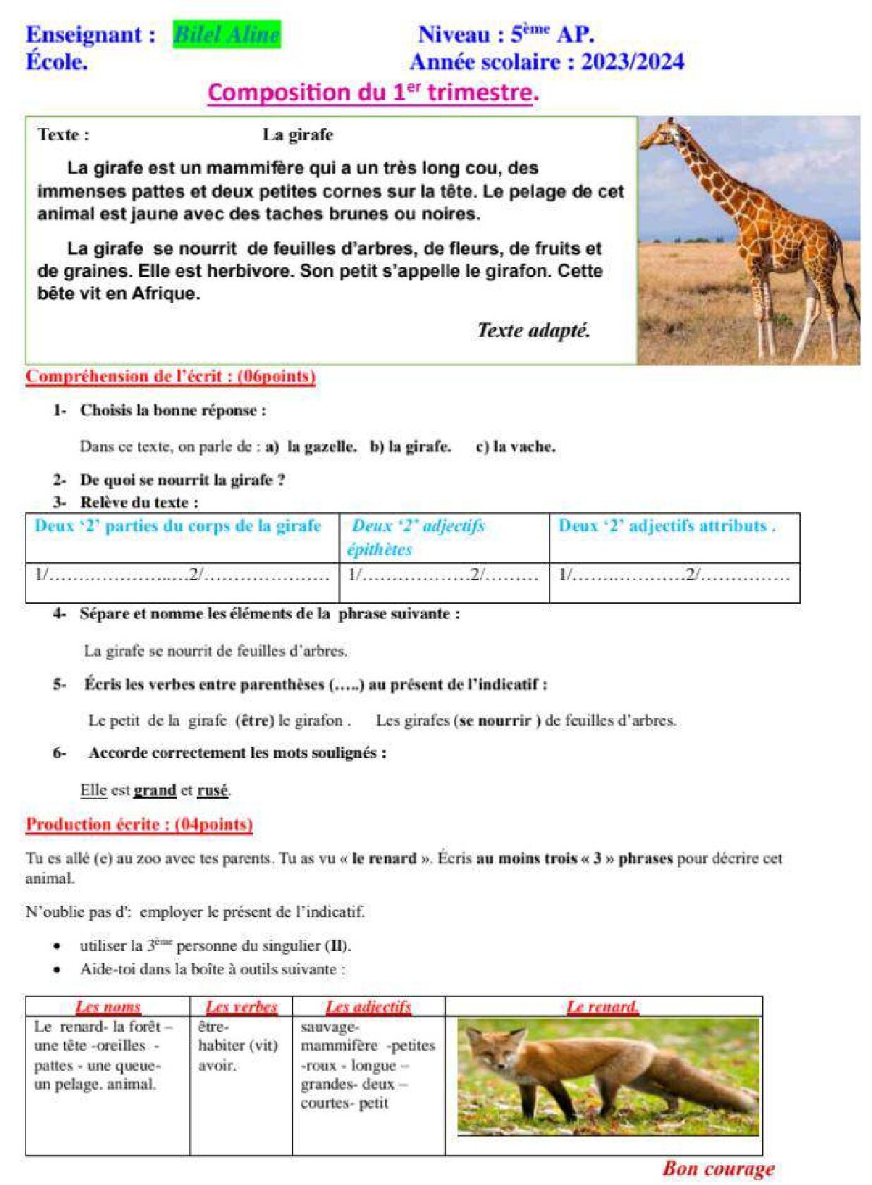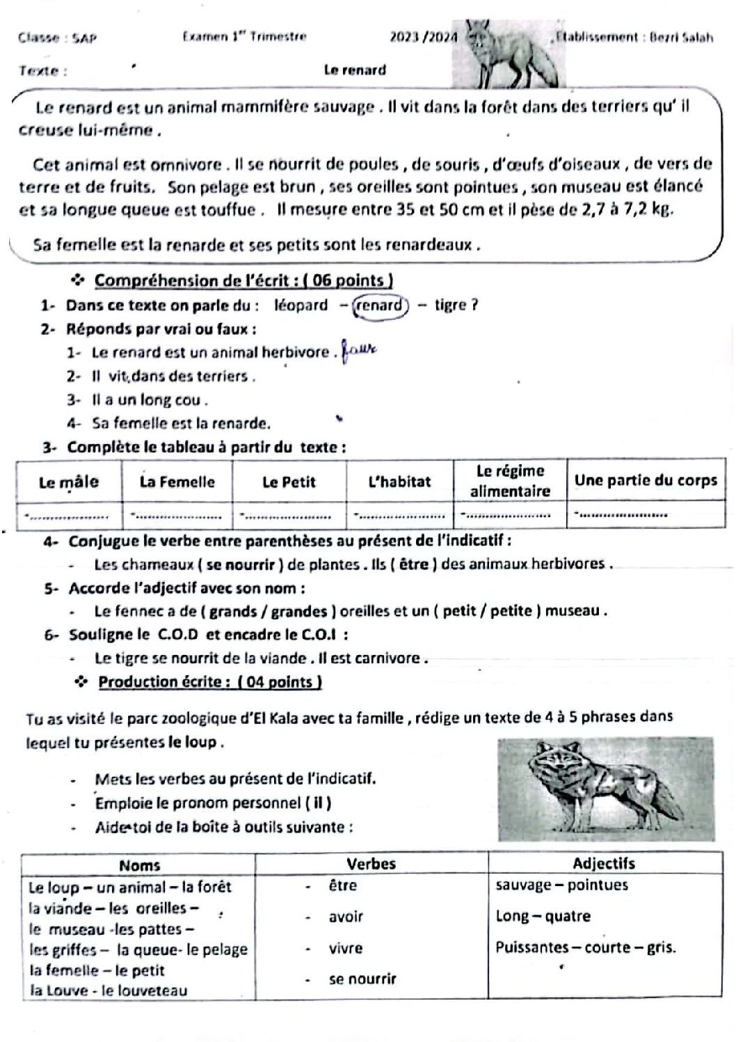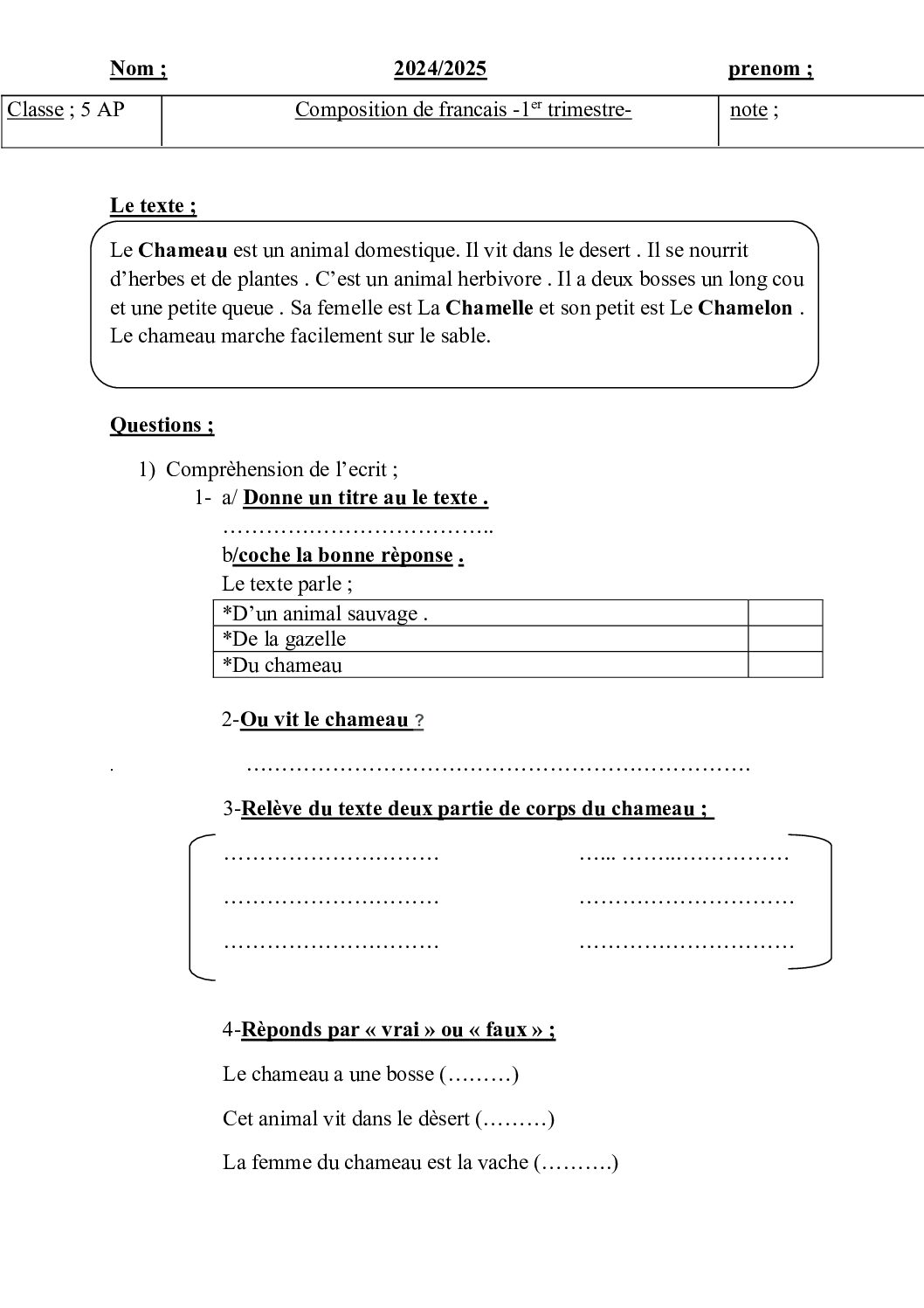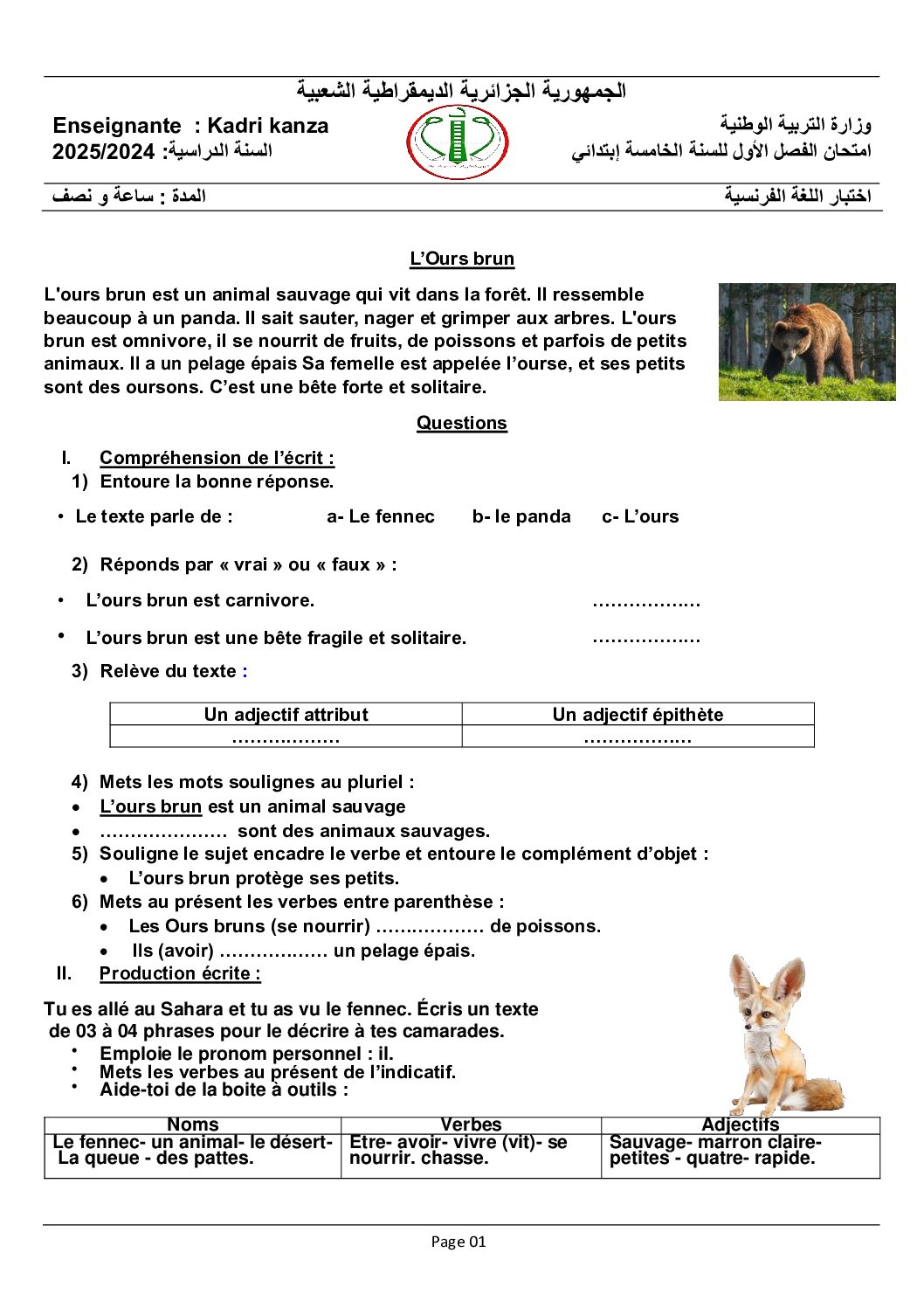 إختبار الفصل الأول في اللغة الفرنسية السنة الخامسة ابتدائي رقم 137 مع التصحيح