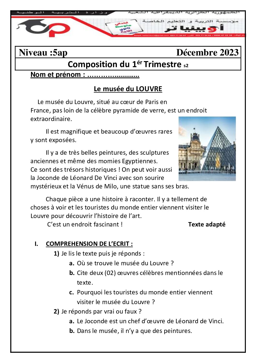 أكمل القراءة »إختبار الفصل الأول في اللغة الفرنسية السنة الخامسة ابتدائي رقم 135 مع التصحيح