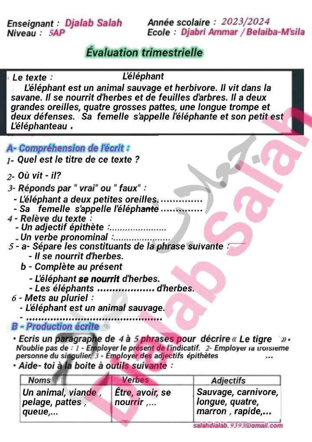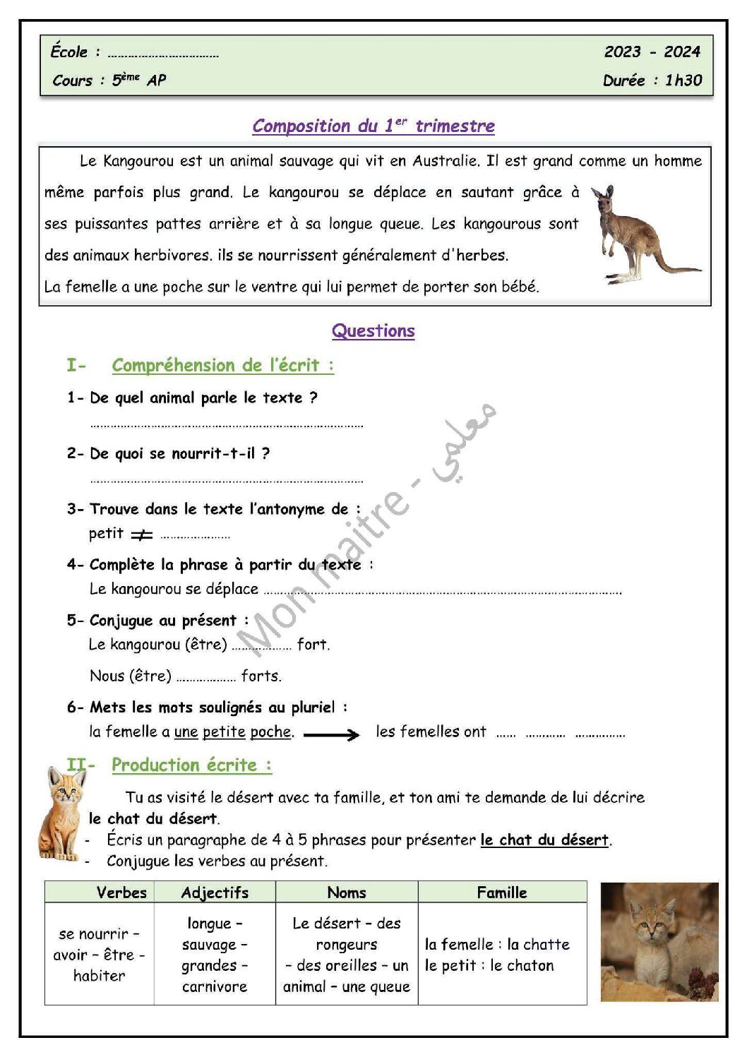 إختبار الفصل الأول في اللغة الفرنسية السنة الخامسة ابتدائي رقم 117 مع التصحيح