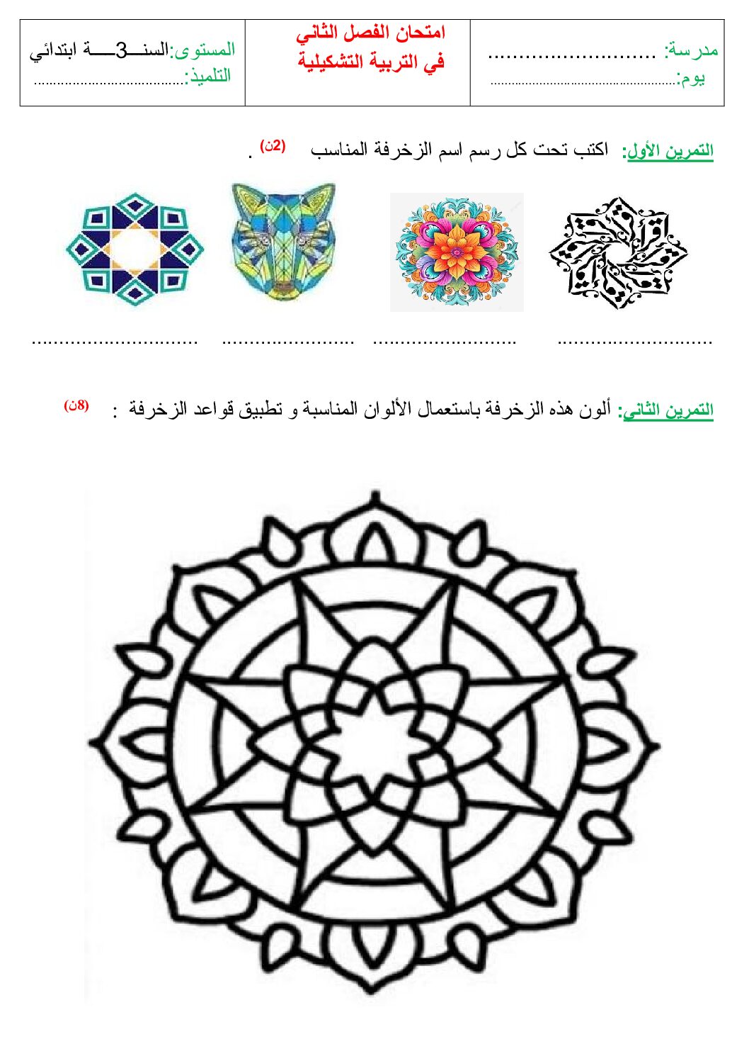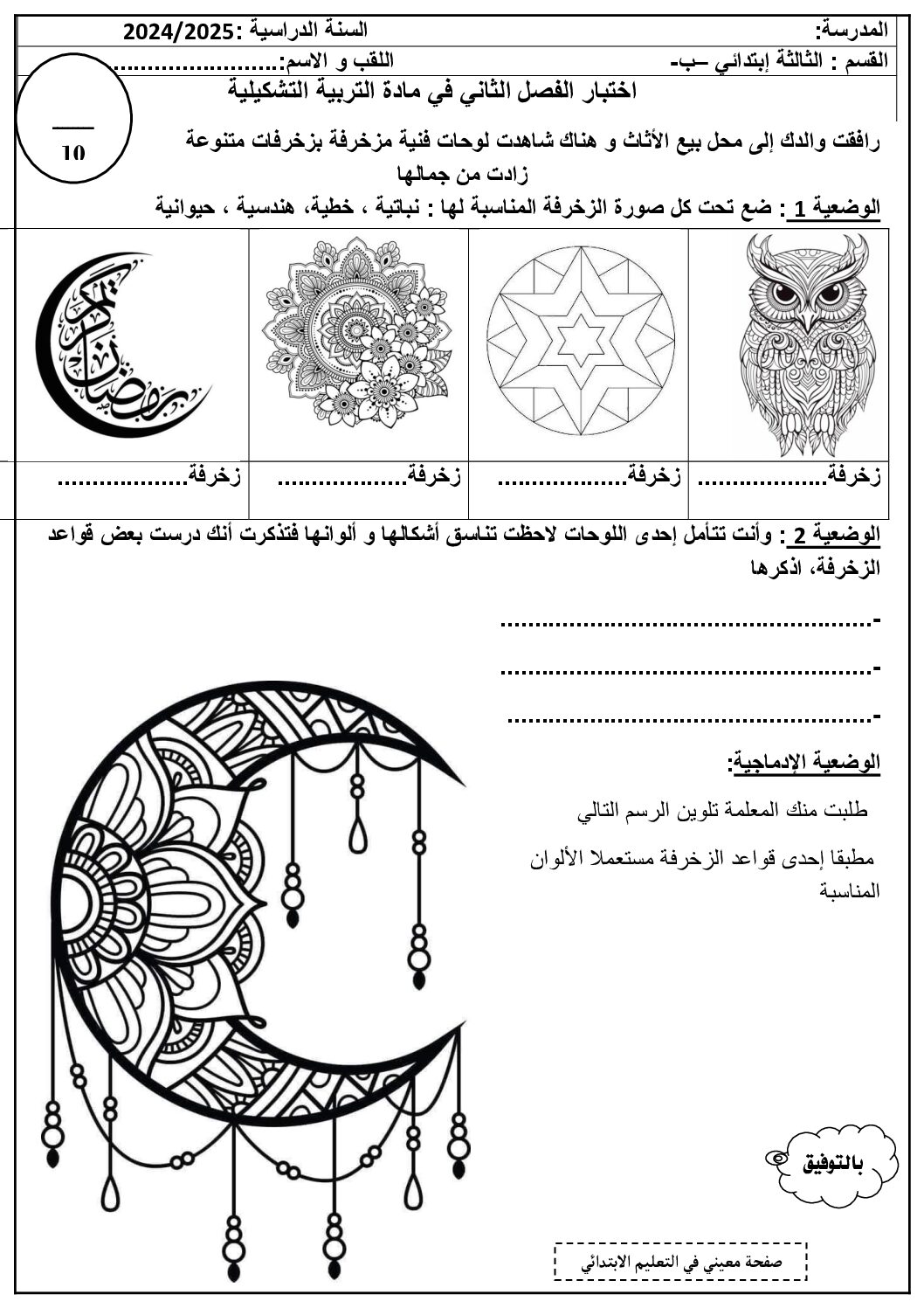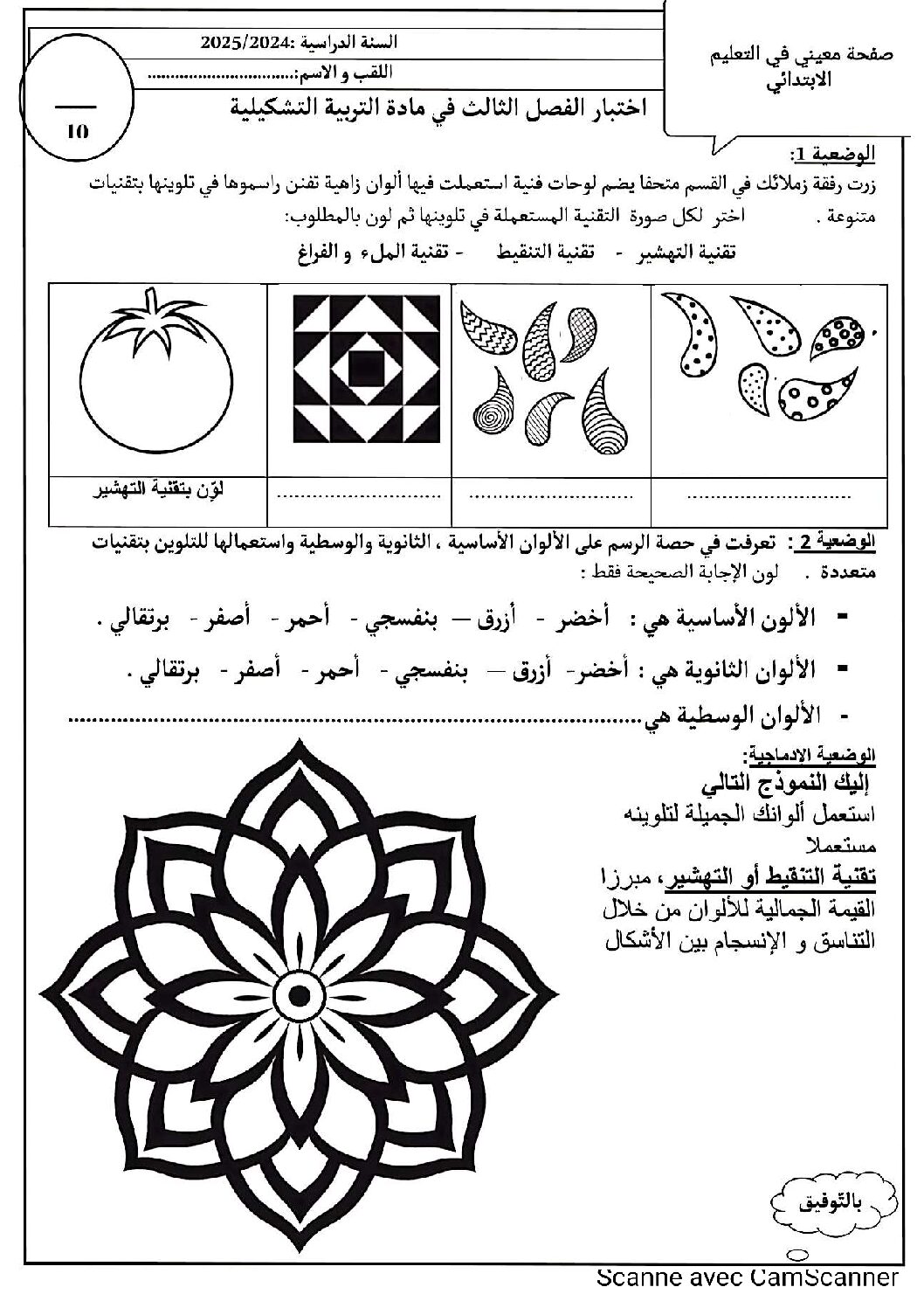 إختبار في التربية الفنية السنة الثالثة ابتدائي رقم 61 مع التصحيح