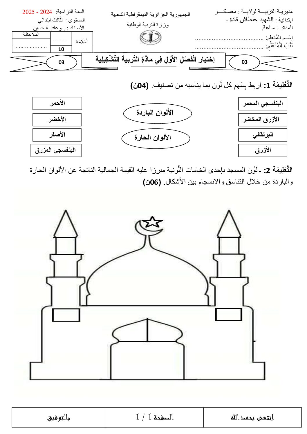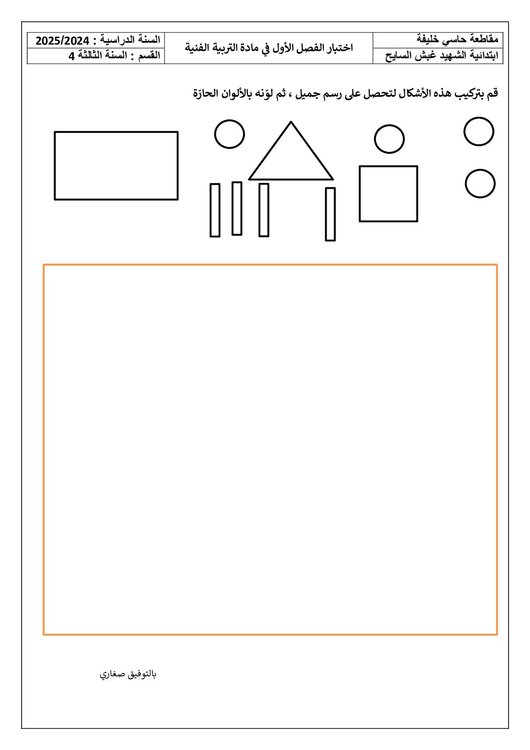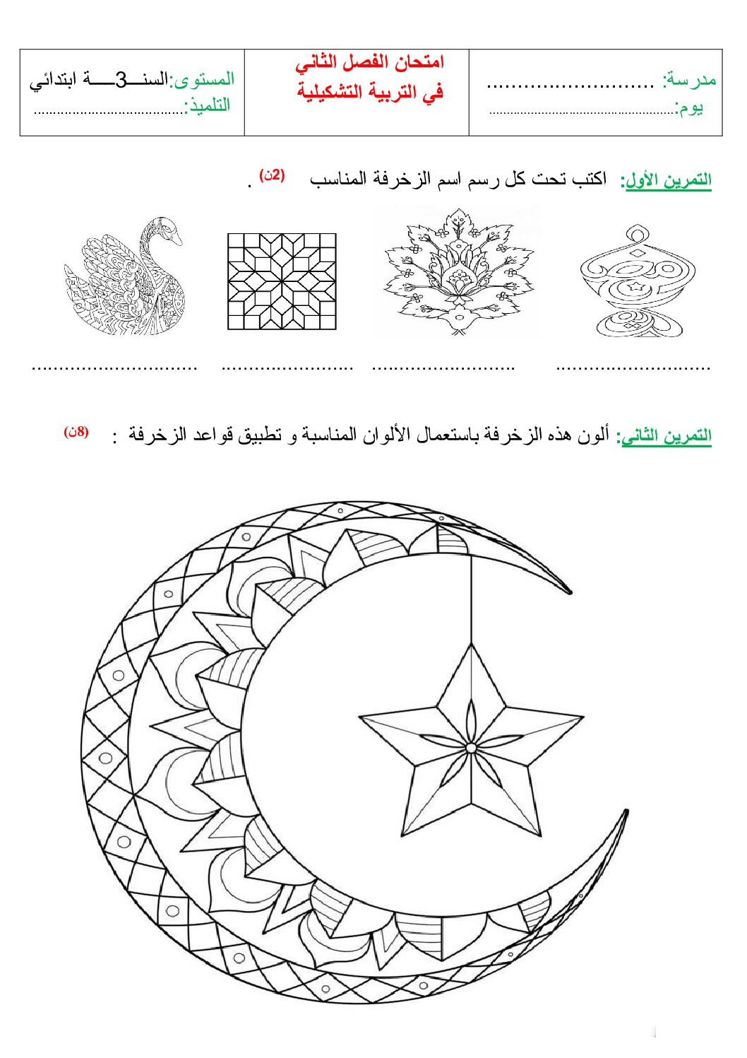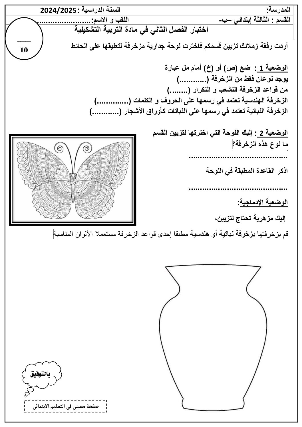 إختبار في التربية الفنية السنة الثالثة ابتدائي رقم 61 مع التصحيح