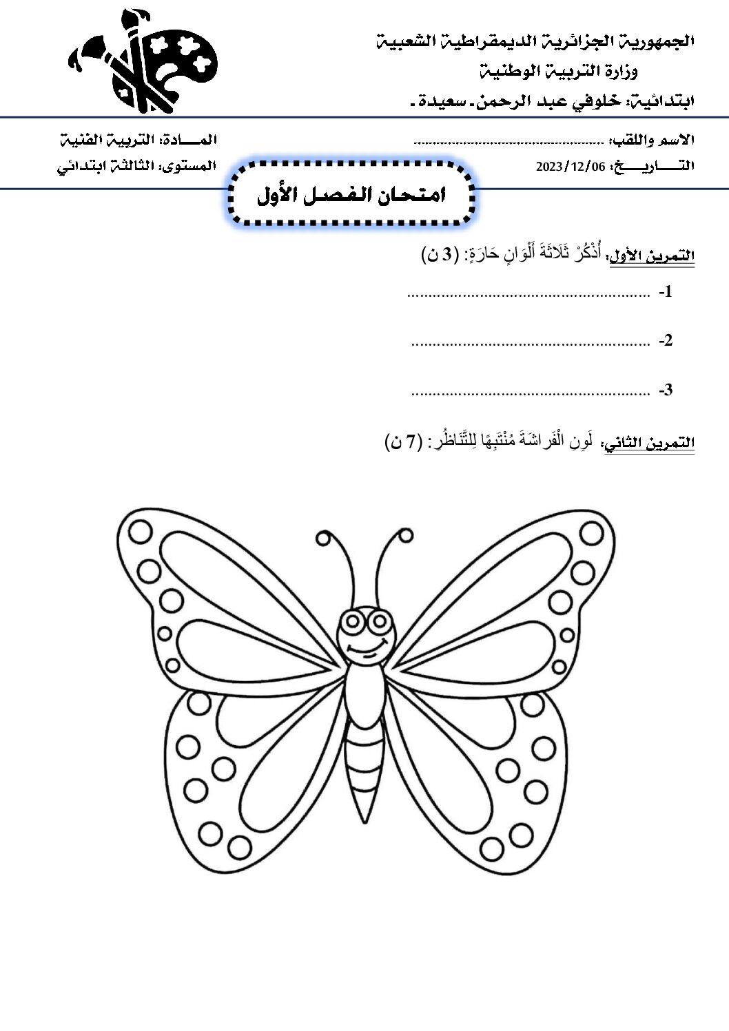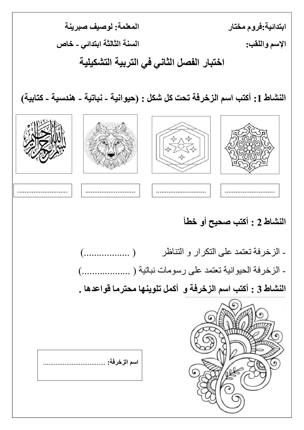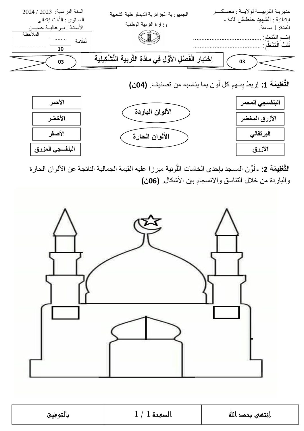 إختبار في التربية الفنية السنة الثالثة ابتدائي رقم 41 مع التصحيح