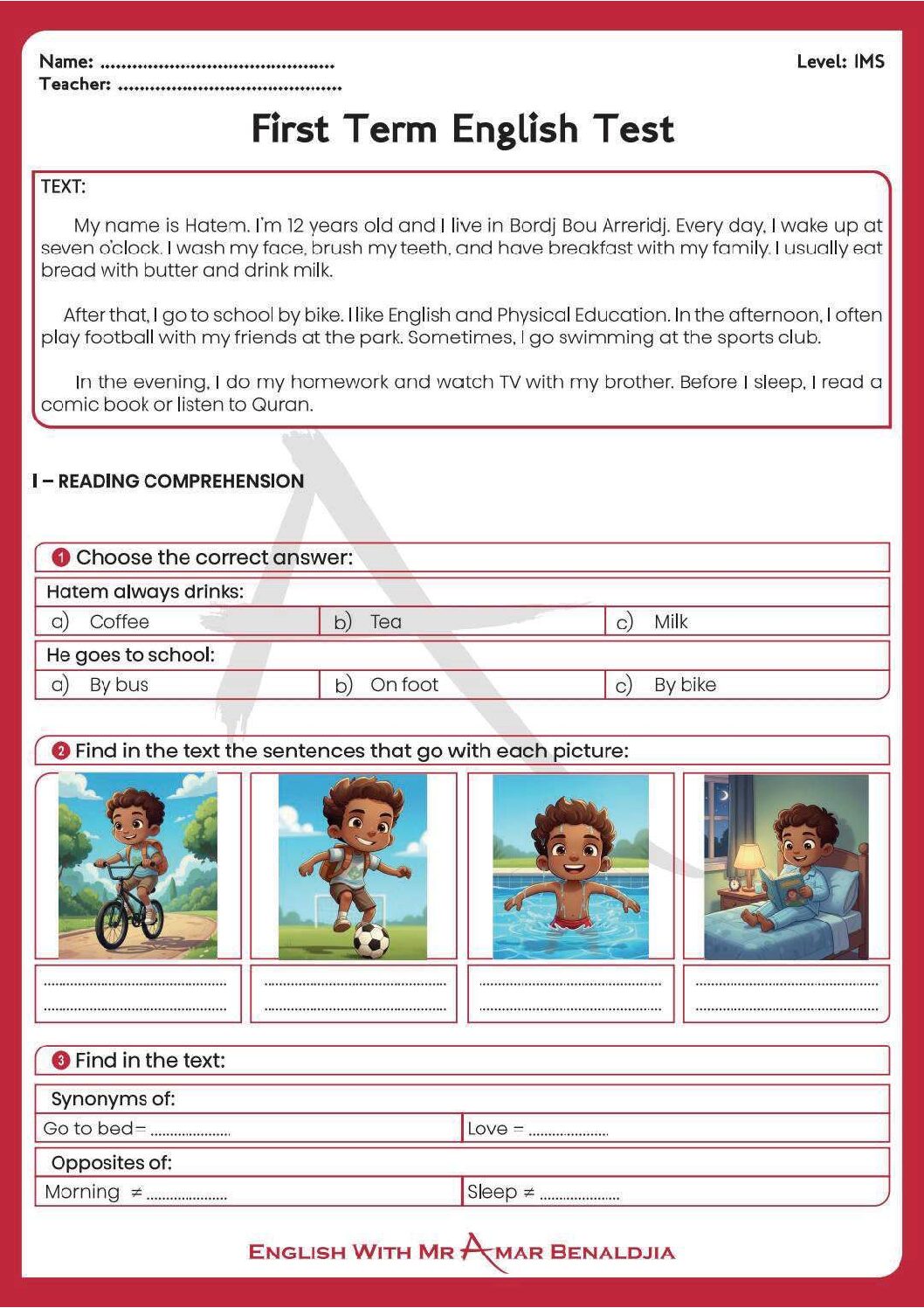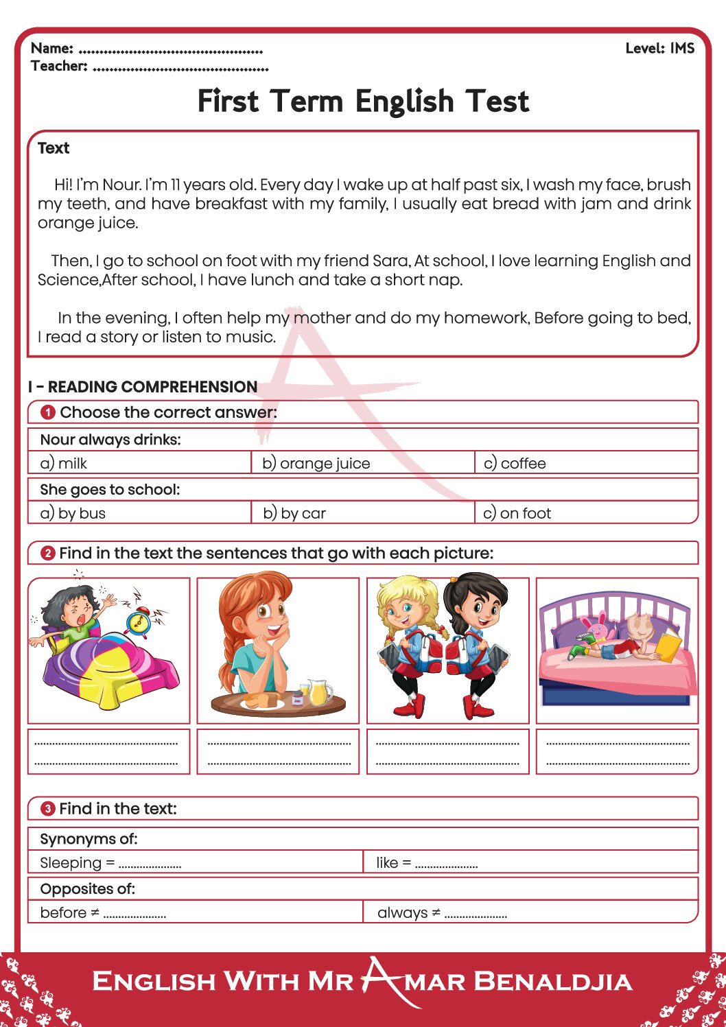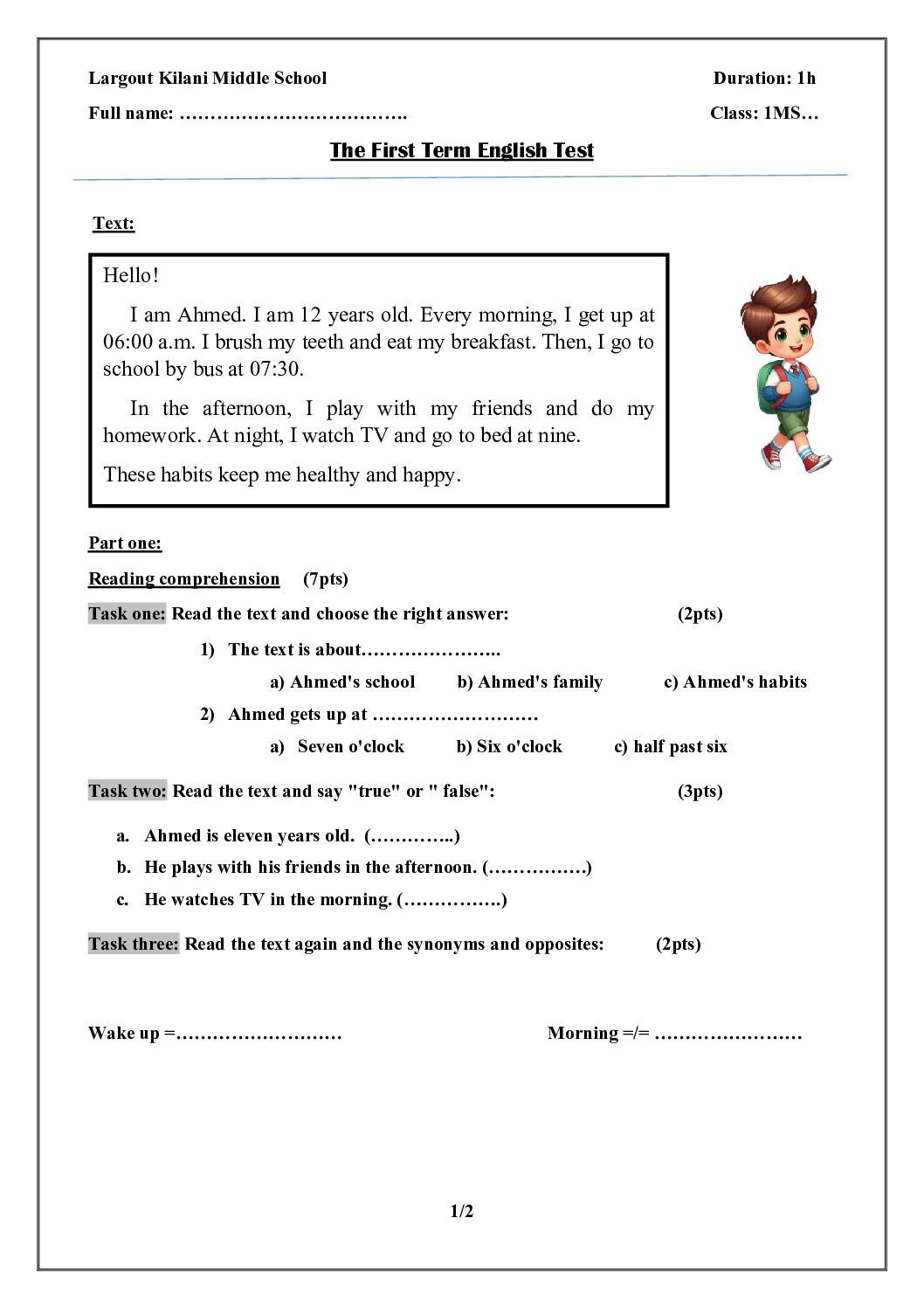 مادة اللغة الإنجليزية للسنة الأولى 1 متوسط دروس مفصلة، فروض واختبارات، تمارين محلولة: نموذج لإمتحان في الفصل الأول رقم 84- في مادة اللغة الإنجليزية مستوى السنة الأولى متوسط الجيل الثاني ، السنة الدراسية: 2025/2026 مع التصحيح يمكن تصفح الاختبار مباشرة عبر موقع الدراسة الجزائري أو تحميله مباشرة بصيغة PDF بالضغط أعلاه على: .: تحميل :. اللغة الإنجليزية السنة الأولى متوسط