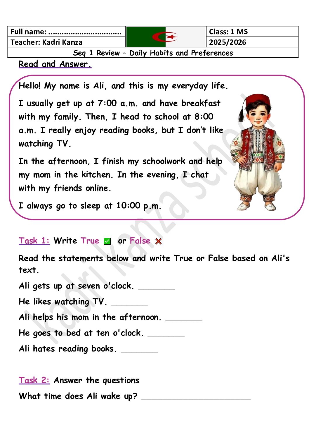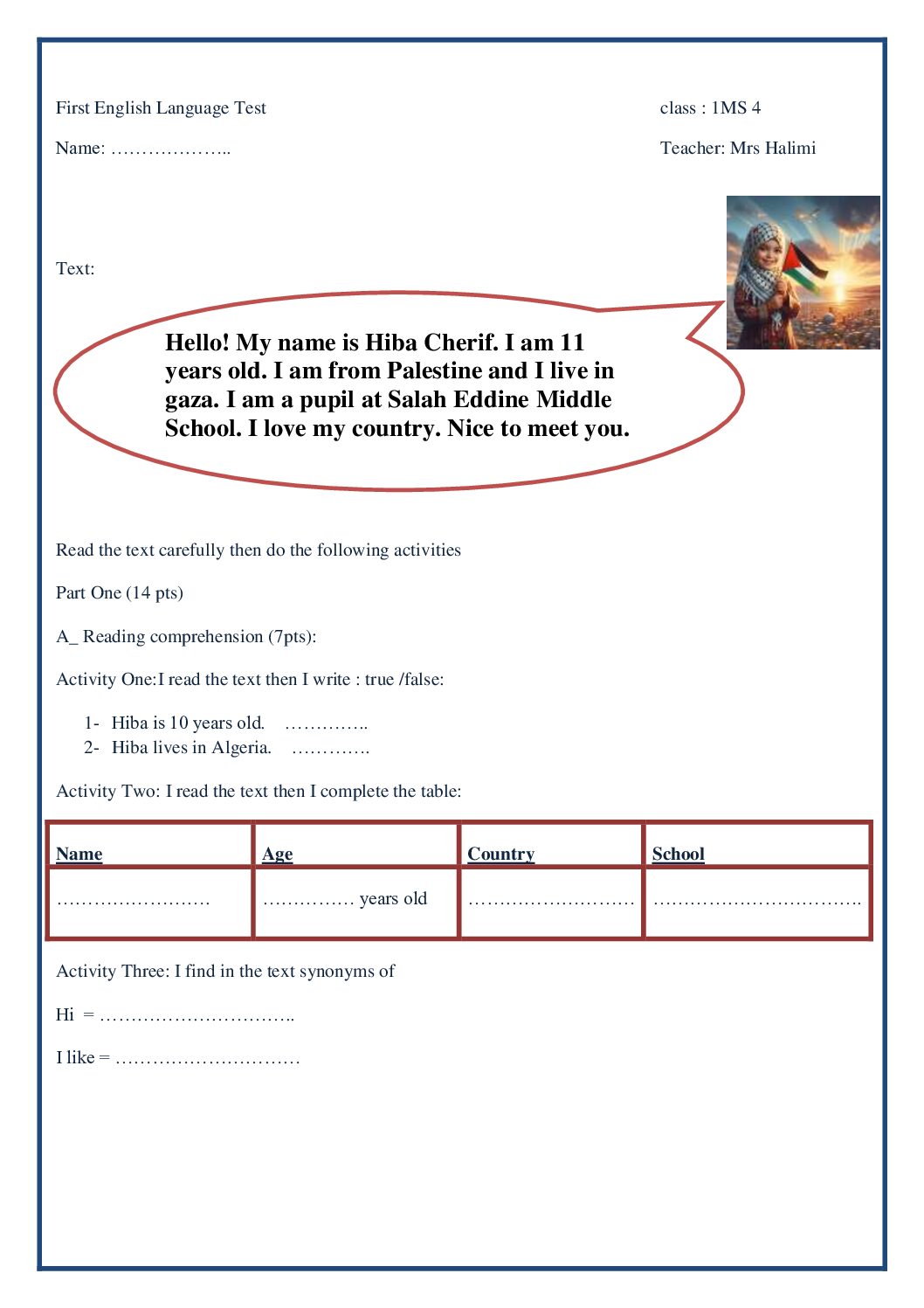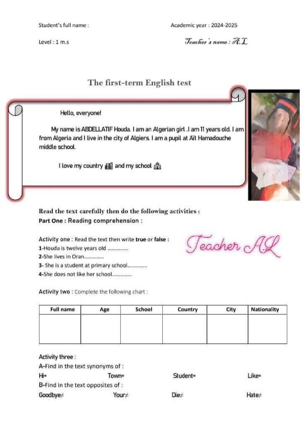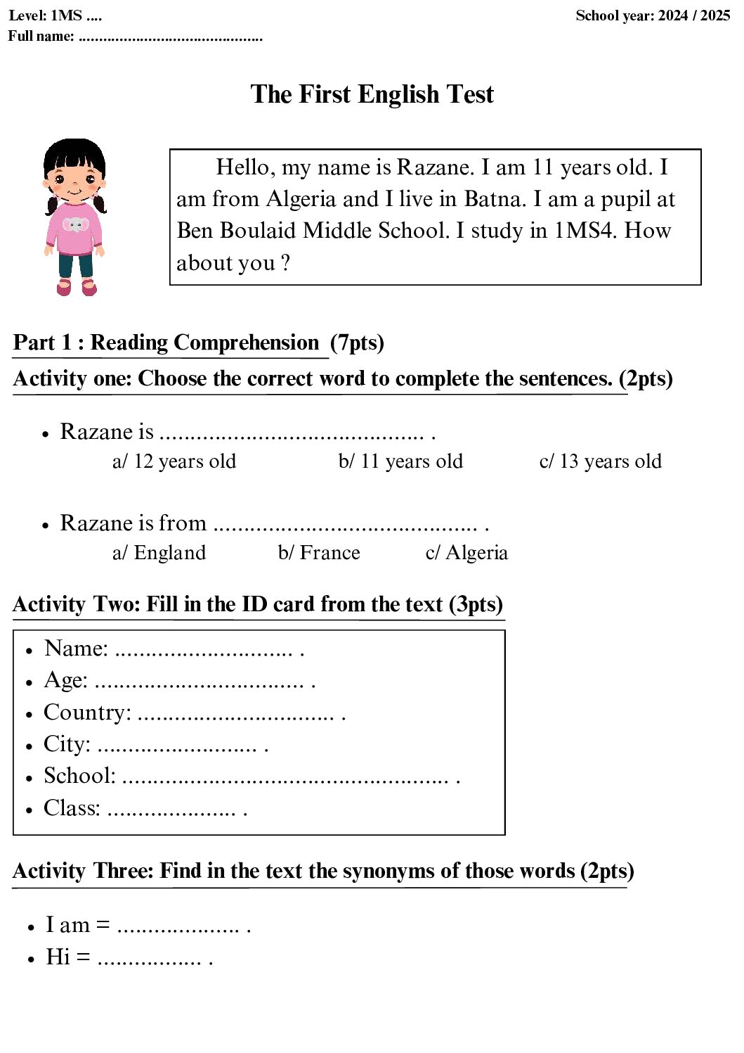 مادة اللغة الإنجليزية للسنة الأولى 1 متوسط دروس مفصلة، فروض واختبارات، تمارين محلولة: نموذج لإمتحان في الفصل الأول رقم 84- في مادة اللغة الإنجليزية مستوى السنة الأولى متوسط الجيل الثاني ، السنة الدراسية: 2025/2026 مع التصحيح يمكن تصفح الاختبار مباشرة عبر موقع الدراسة الجزائري أو تحميله مباشرة بصيغة PDF بالضغط أعلاه على: .: تحميل :. اللغة الإنجليزية السنة الأولى متوسط