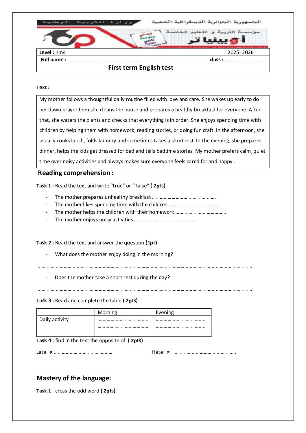 مادة اللغة الإنجليزية للسنة الأولى 1 متوسط دروس مفصلة، فروض واختبارات، تمارين محلولة: نموذج لإمتحان في الفصل الأول رقم 86- في مادة اللغة الإنجليزية مستوى السنة الأولى متوسط الجيل الثاني ، السنة الدراسية: 2025/2026 مع التصحيح يمكن تصفح الاختبار مباشرة عبر موقع الدراسة الجزائري أو تحميله مباشرة بصيغة PDF بالضغط أعلاه على: .: تحميل :. اللغة الإنجليزية السنة الأولى متوسط