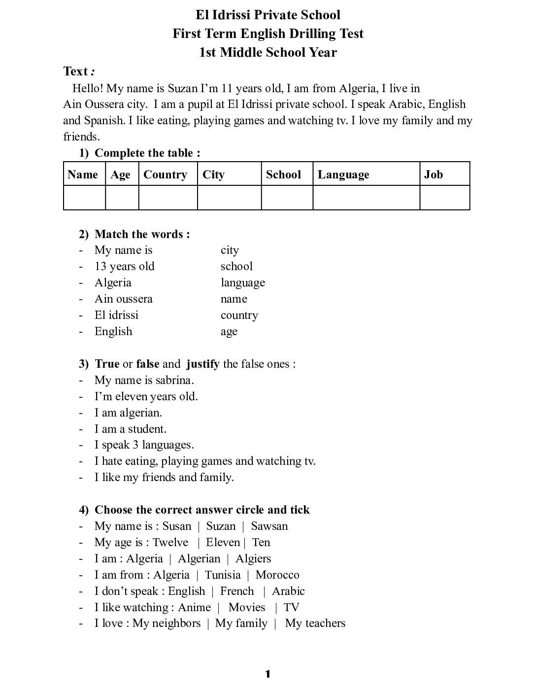 مادة اللغة الإنجليزية للسنة الأولى 1 متوسط دروس مفصلة، فروض واختبارات، تمارين محلولة: نموذج لإمتحان في الفصل الأول رقم 74- في مادة اللغة الإنجليزية مستوى السنة الأولى متوسط الجيل الثاني ، السنة الدراسية: 2025/2026 مع التصحيح يمكن تصفح الاختبار مباشرة عبر موقع الدراسة الجزائري أو تحميله مباشرة بصيغة PDF بالضغط أعلاه على: .: تحميل :. اللغة الإنجليزية السنة الأولى متوسط