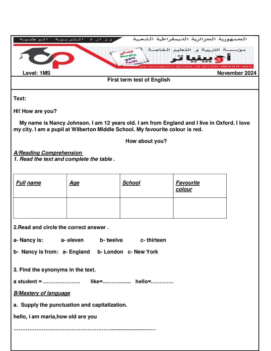مادة اللغة الإنجليزية للسنة الأولى 1 متوسط دروس مفصلة، فروض واختبارات، تمارين محلولة: نموذج لإمتحان في الفصل الأول رقم 73- في مادة اللغة الإنجليزية مستوى السنة الأولى متوسط الجيل الثاني ، السنة الدراسية: 2025/2026 مع التصحيح يمكن تصفح الاختبار مباشرة عبر موقع الدراسة الجزائري أو تحميله مباشرة بصيغة PDF بالضغط أعلاه على: .: تحميل :. اللغة الإنجليزية السنة الأولى متوسط