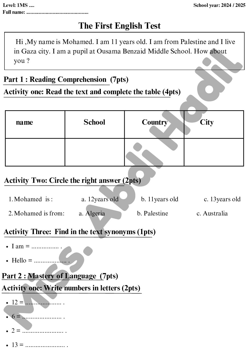 مادة اللغة الإنجليزية للسنة الأولى 1 متوسط دروس مفصلة، فروض واختبارات، تمارين محلولة: نموذج لإمتحان في الفصل الأول رقم 80- في مادة اللغة الإنجليزية مستوى السنة الأولى متوسط الجيل الثاني ، السنة الدراسية: 2025/2026 مع التصحيح يمكن تصفح الاختبار مباشرة عبر موقع الدراسة الجزائري أو تحميله مباشرة بصيغة PDF بالضغط أعلاه على: .: تحميل :. اللغة الإنجليزية السنة الأولى متوسط