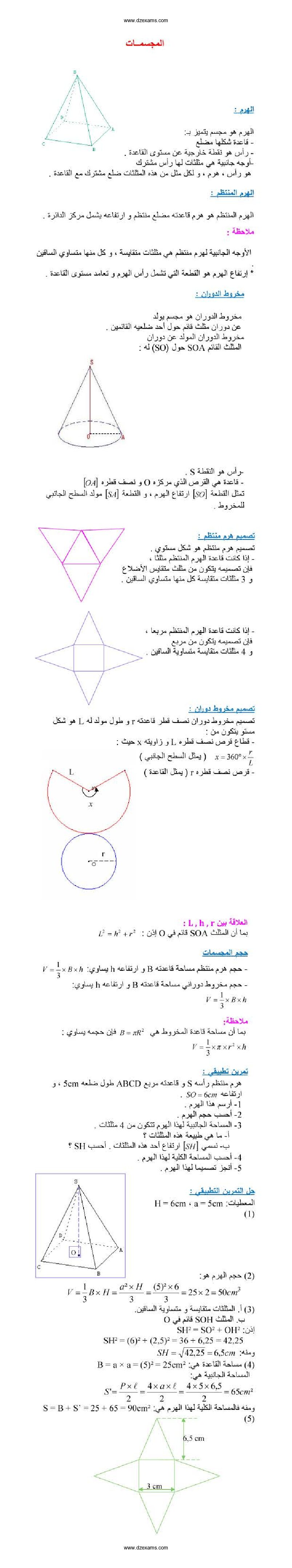 ملخص درس المجسمات في الرياضيات 3 متوسط