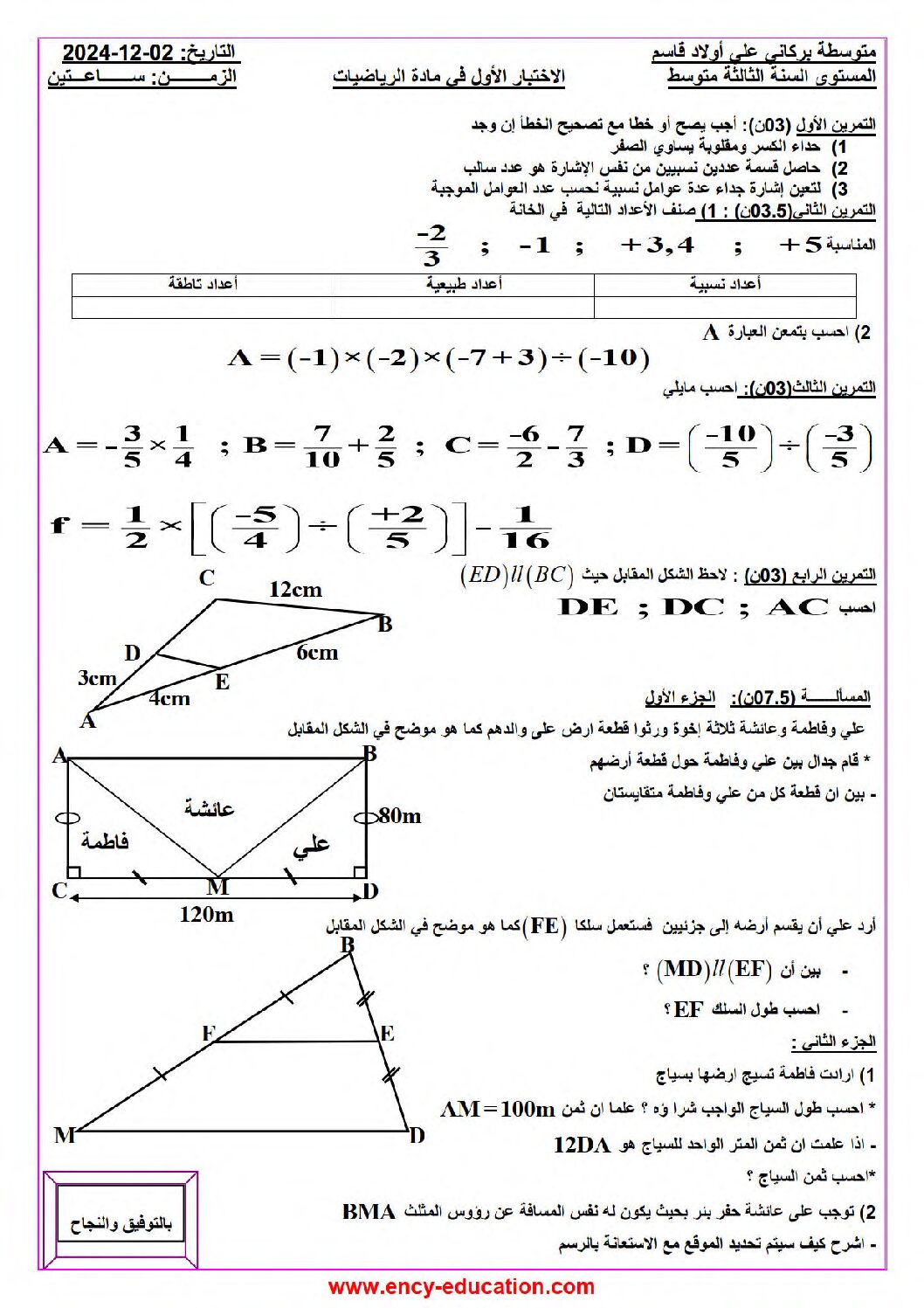 واجب منزلي في الرياضيات السنة الثالثة متوسط رقم 1