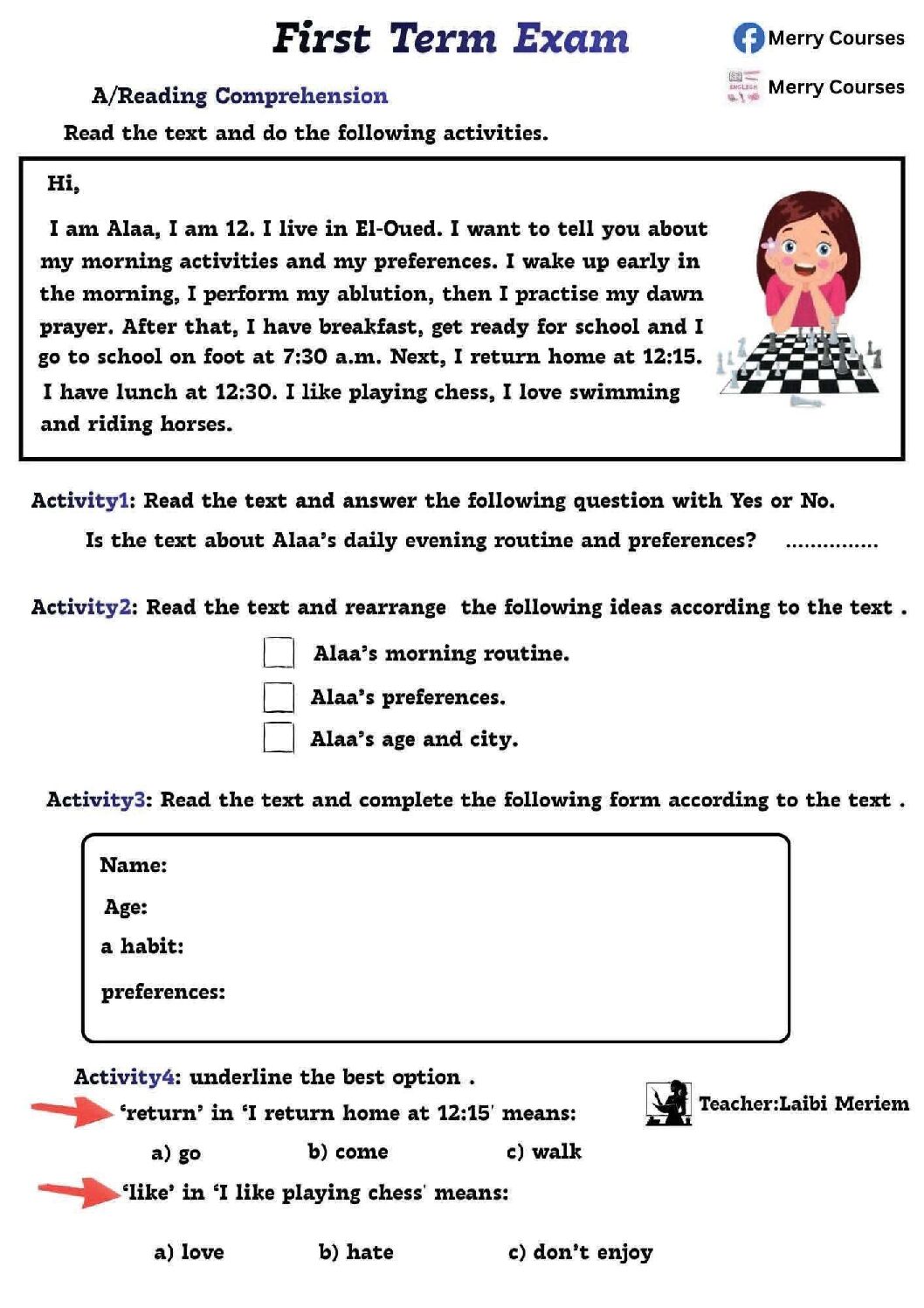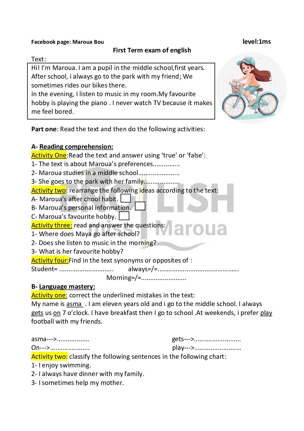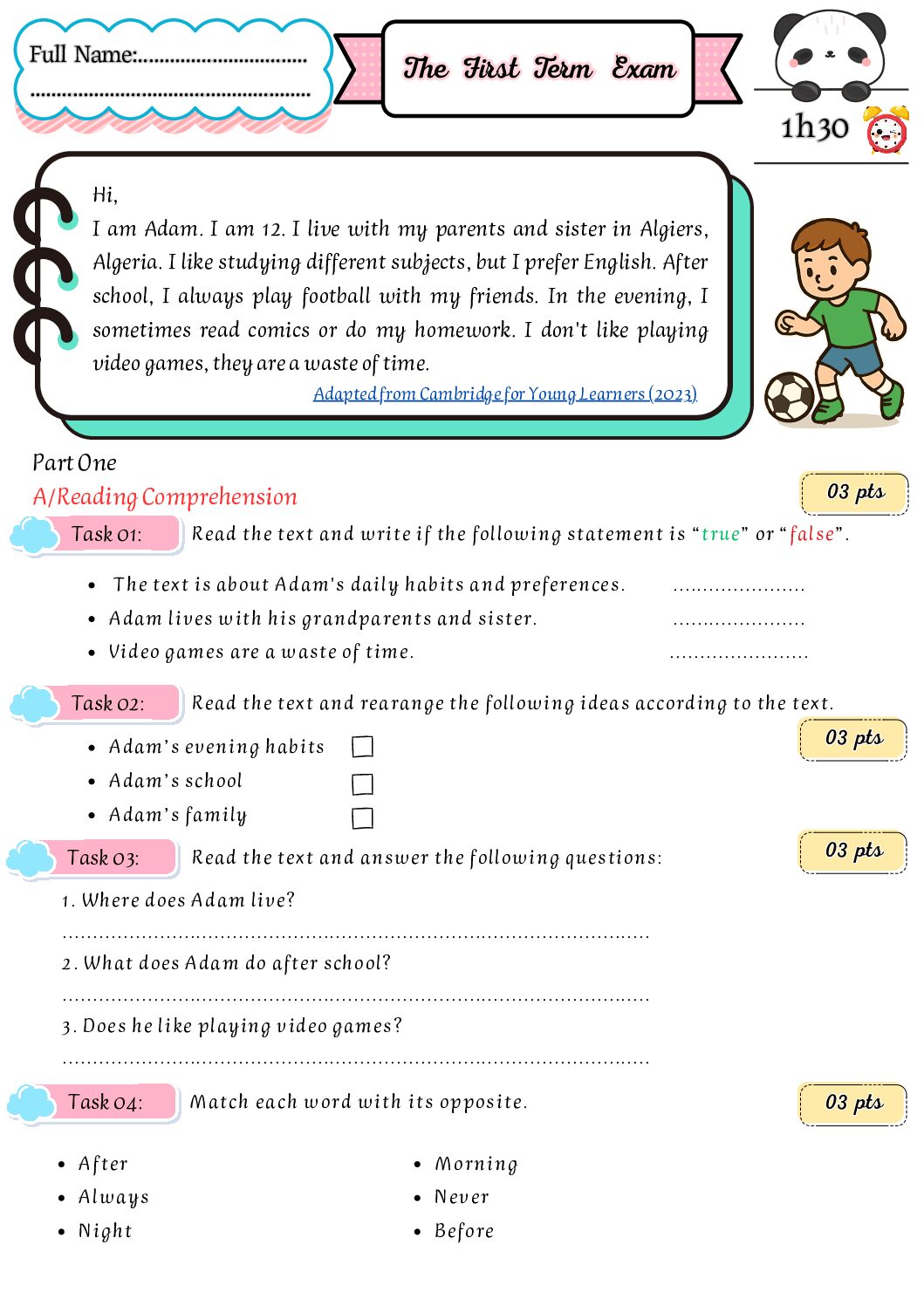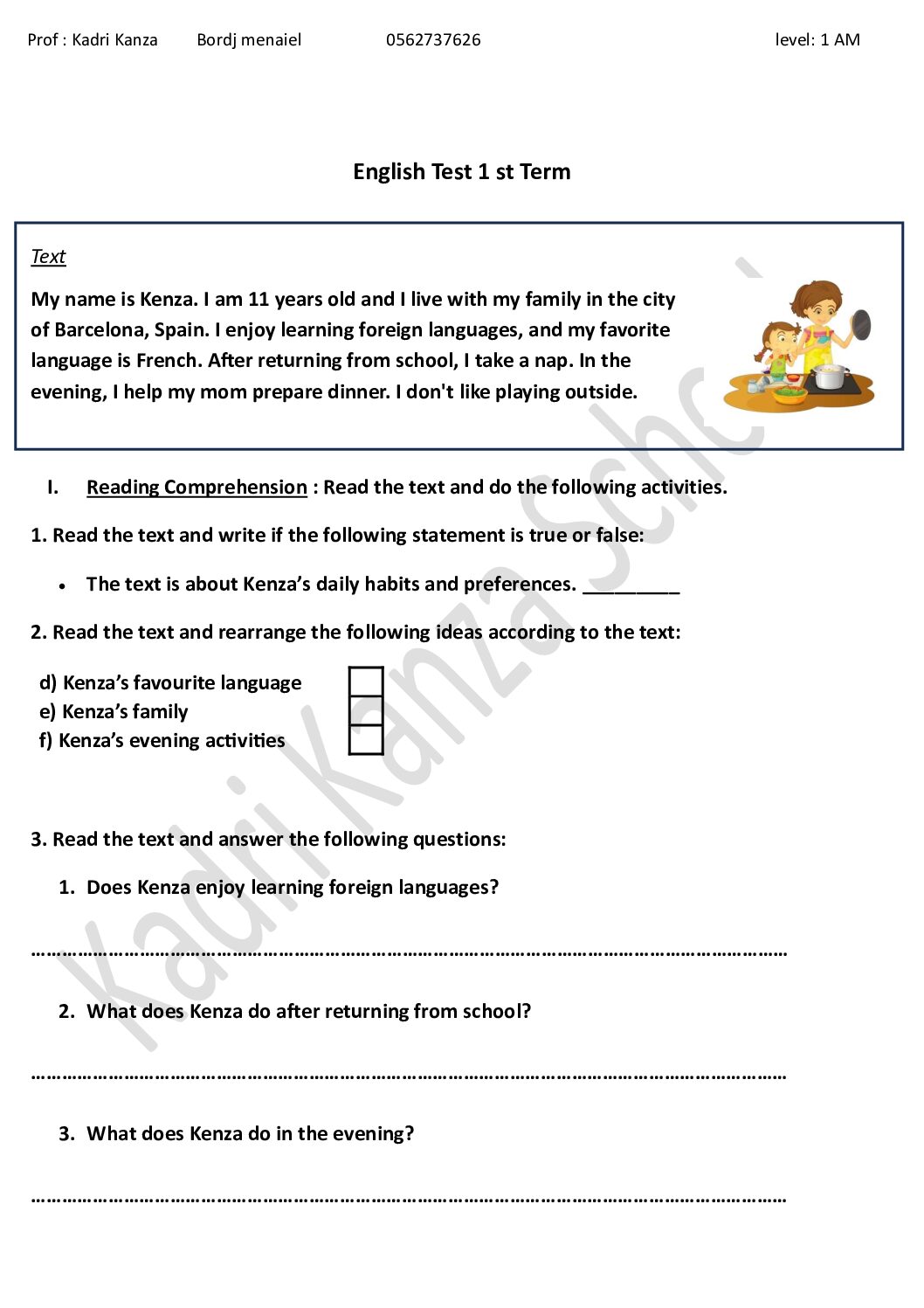 اختبار في اللغة الانجليزية الفصل الأول السنة الأولى متوسط رقم 72