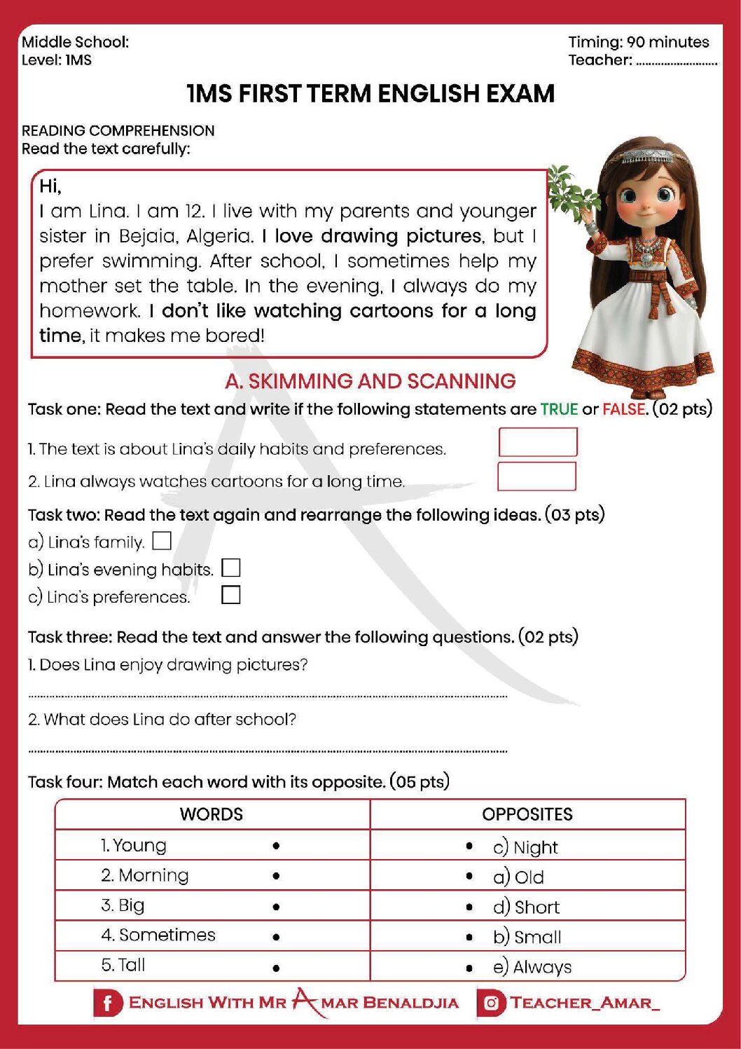 مادة اللغة الإنجليزية للسنة الأولى 1 متوسط دروس مفصلة، فروض واختبارات، تمارين محلولة: نموذج لإمتحان في الفصل الأول رقم 71- في مادة اللغة الإنجليزية مستوى السنة الأولى متوسط الجيل الثاني ، السنة الدراسية: 2025/2026 مع التصحيح يمكن تصفح الاختبار مباشرة عبر موقع الدراسة الجزائري أو تحميله مباشرة بصيغة PDF بالضغط أعلاه على: .: تحميل :. اللغة الإنجليزية السنة الأولى متوسط