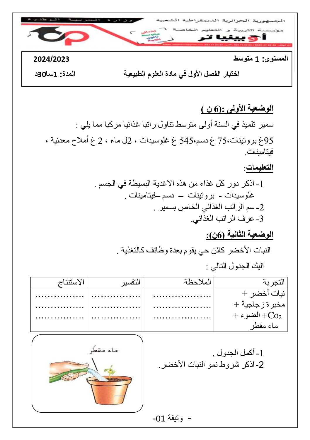 مادة علوم الطبيعة والحياة للسنة الأولى 1 متوسط دروس مفصلة، فروض واختبارات، تمارين محلولة: نموذج لإمتحان في الفصل الأول رقم 48- في مادة العلوم الطبيعية مستوى السنة الأولى متوسط الجيل الثاني ، السنة الدراسية: 2025/2026 مع التصحيح يمكن تصفح الإختبار مباشرة عبر موقع الدراسة الجزائري أو تحميله مباشرة بصيغة PDF بالضغط أعلاه على: .: تحميل :. العلوم الطبيعية السنة الأولى متوسط