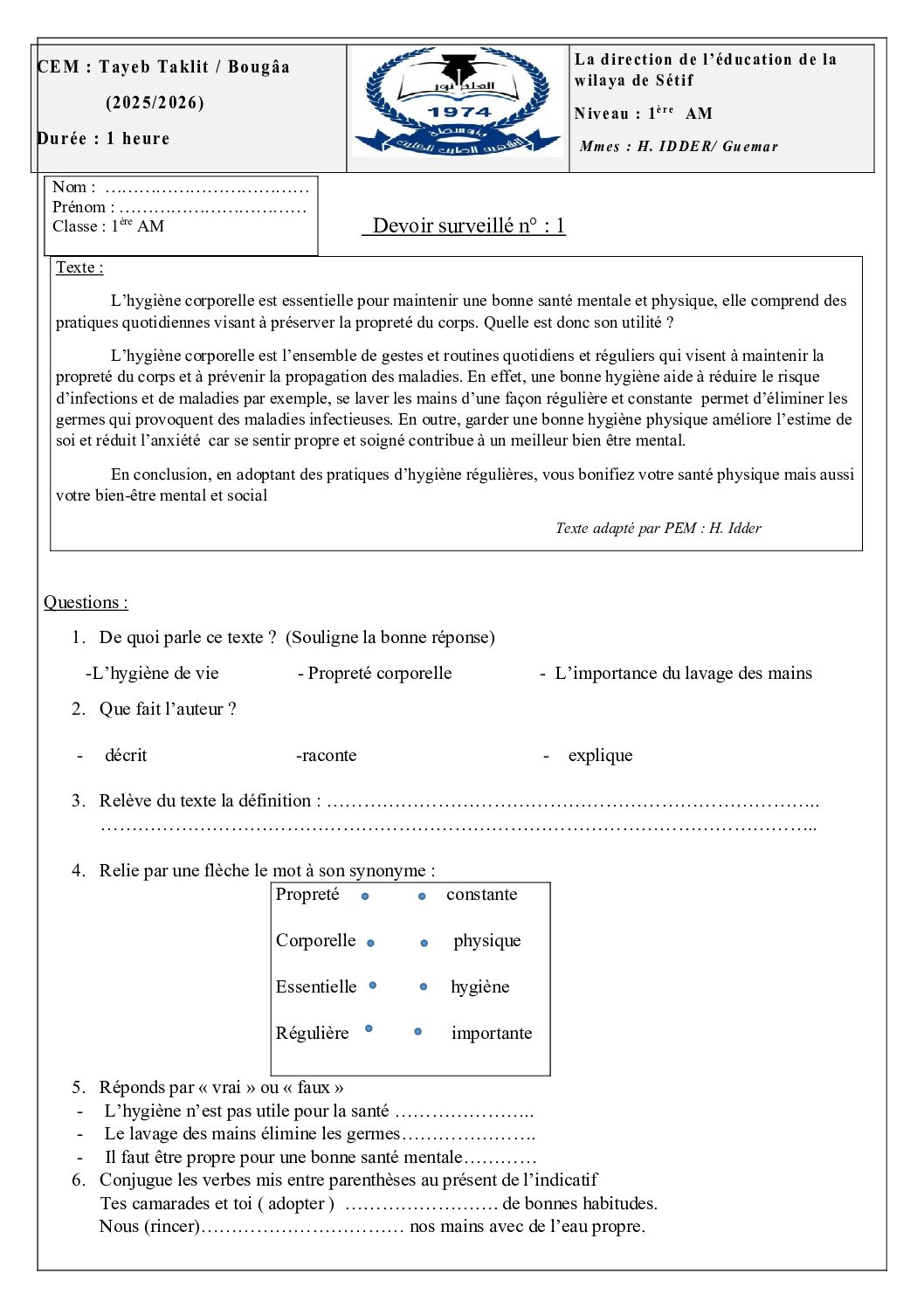 أكمل القراءة »فرض في اللغة الفرنسية الفصل الأول السنة الأولى متوسط رقم 73 مع التصحيح