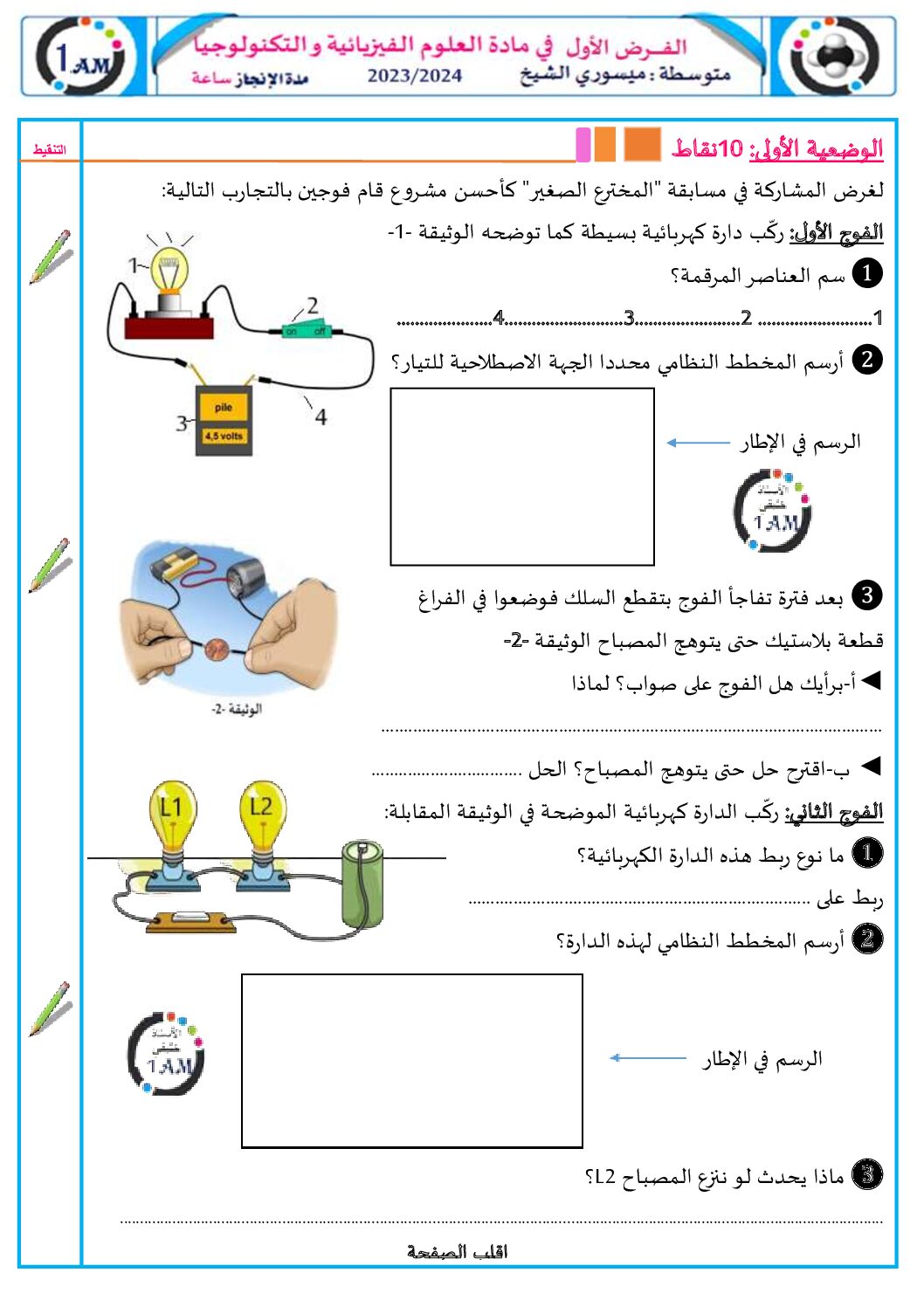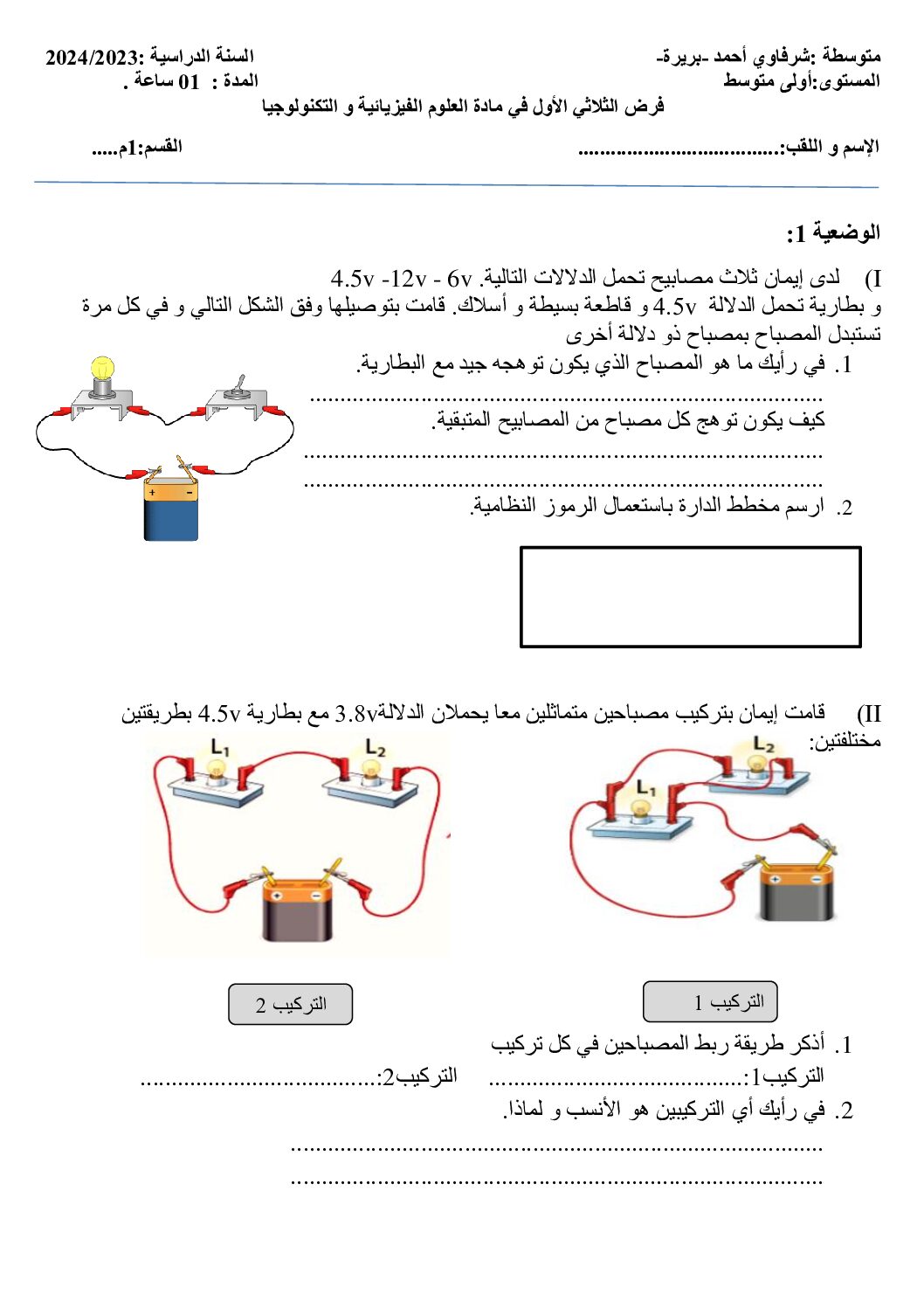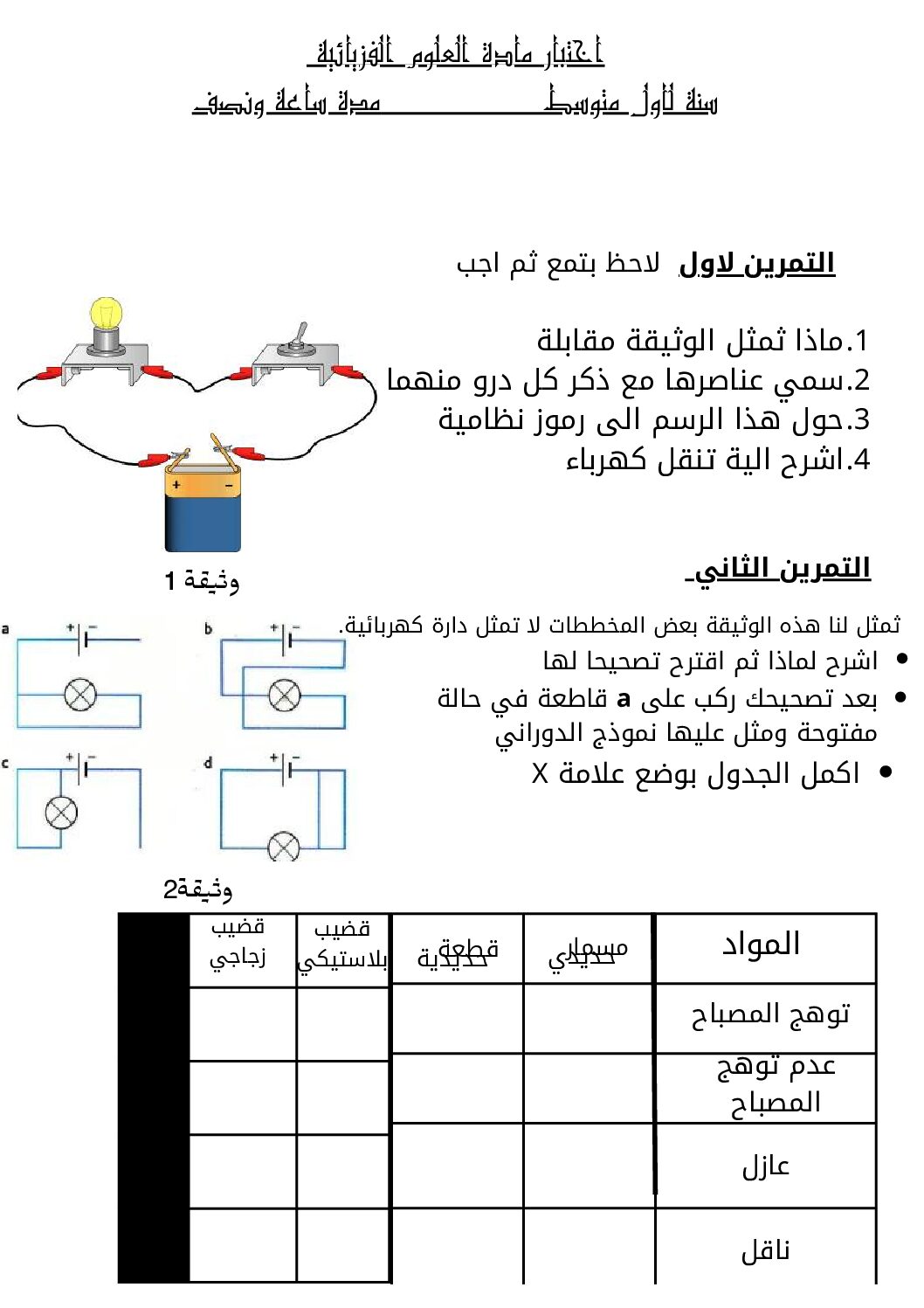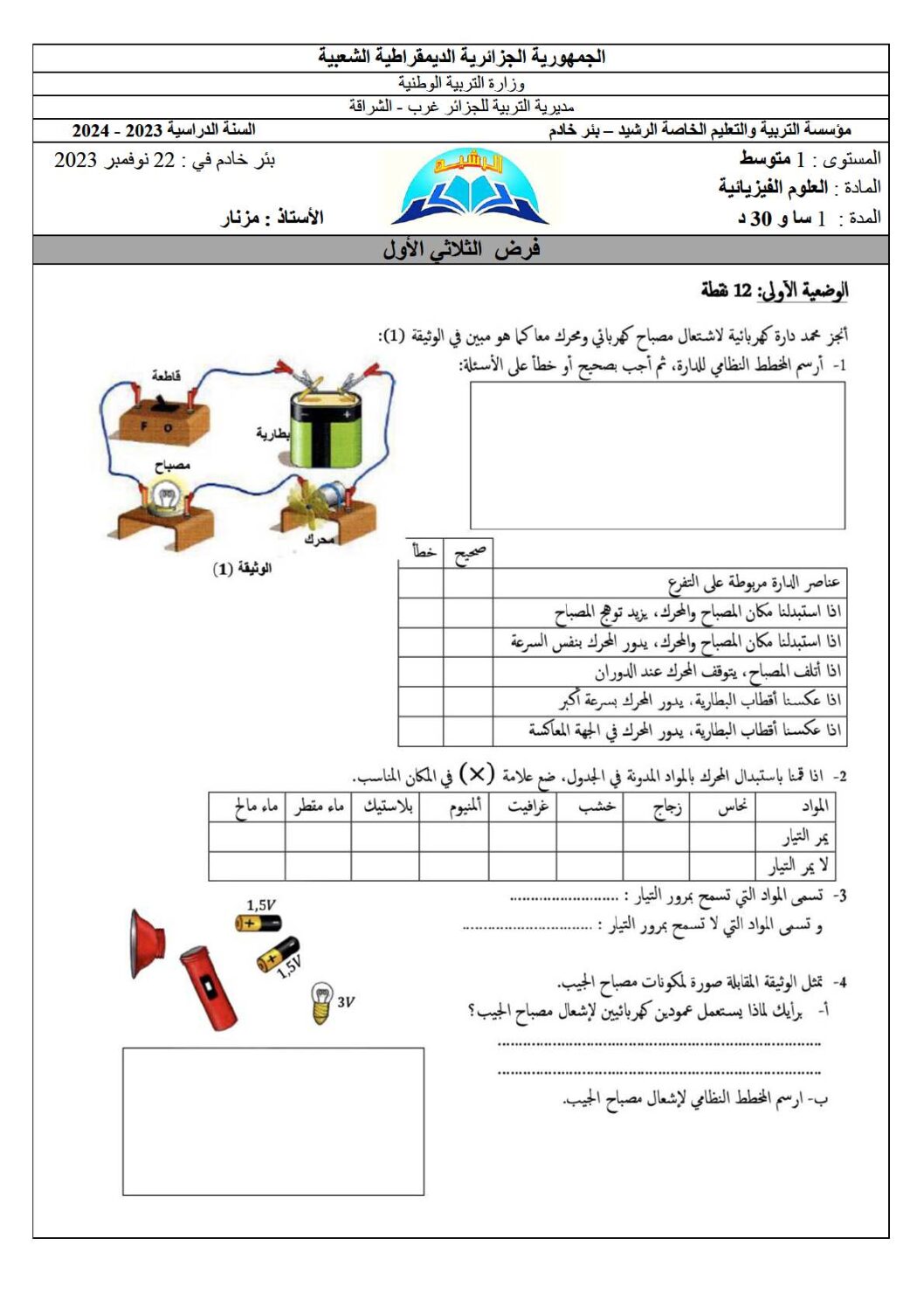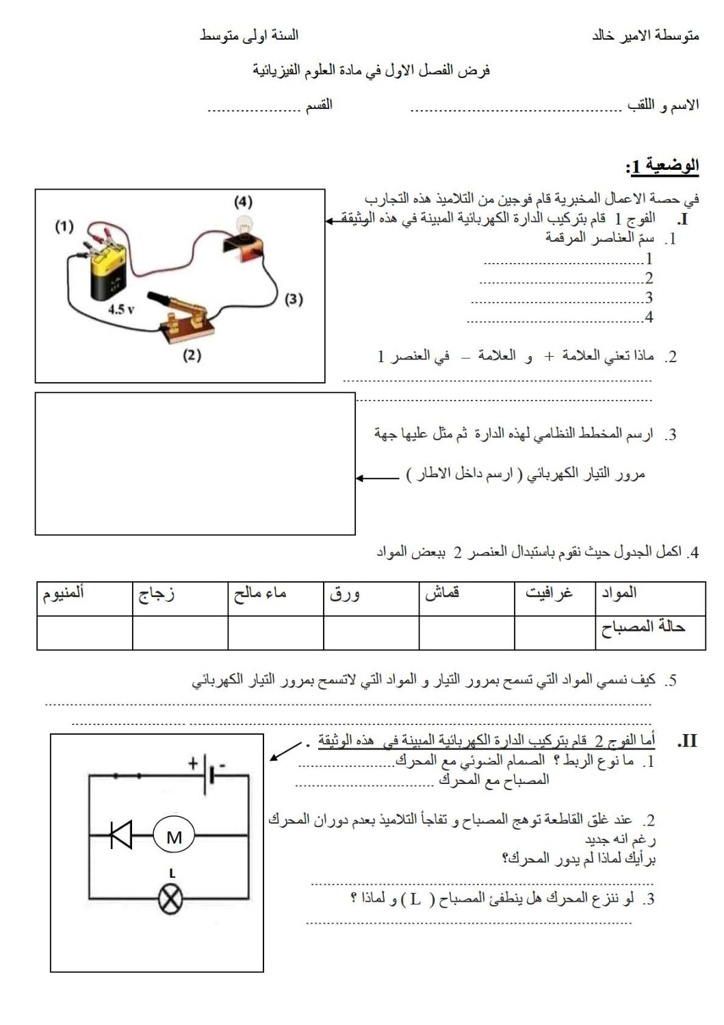 فرض في العلوم الفيزيائية الفصل الأول السنة الأولى متوسط رقم 78