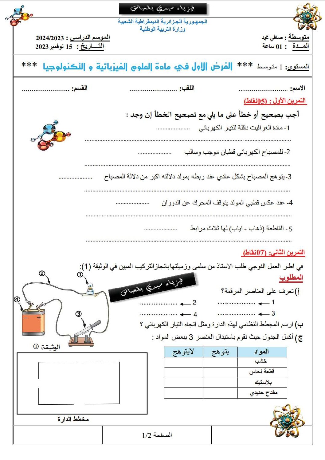 مادة العلوم الفيزيائية والتكنولوجيا للسنة الأولى 1 متوسط دروس مفصلة، فروض واختبارات، تمارين محلولة: نموذج لإمتحان في الفصل الأول رقم 71- في مادة العلوم الفيزيائية مستوى السنة الأولى متوسط الجيل الثاني ، السنة الدراسية: 2025/2026 مع التصحيح يمكن تصفح الإختبار مباشرة عبر موقع الدراسة الجزائري أو تحميله مباشرة بصيغة PDF بالضغط أعلاه على: .: تحميل :. العلوم الفيزيائية السنة الأولى متوسط