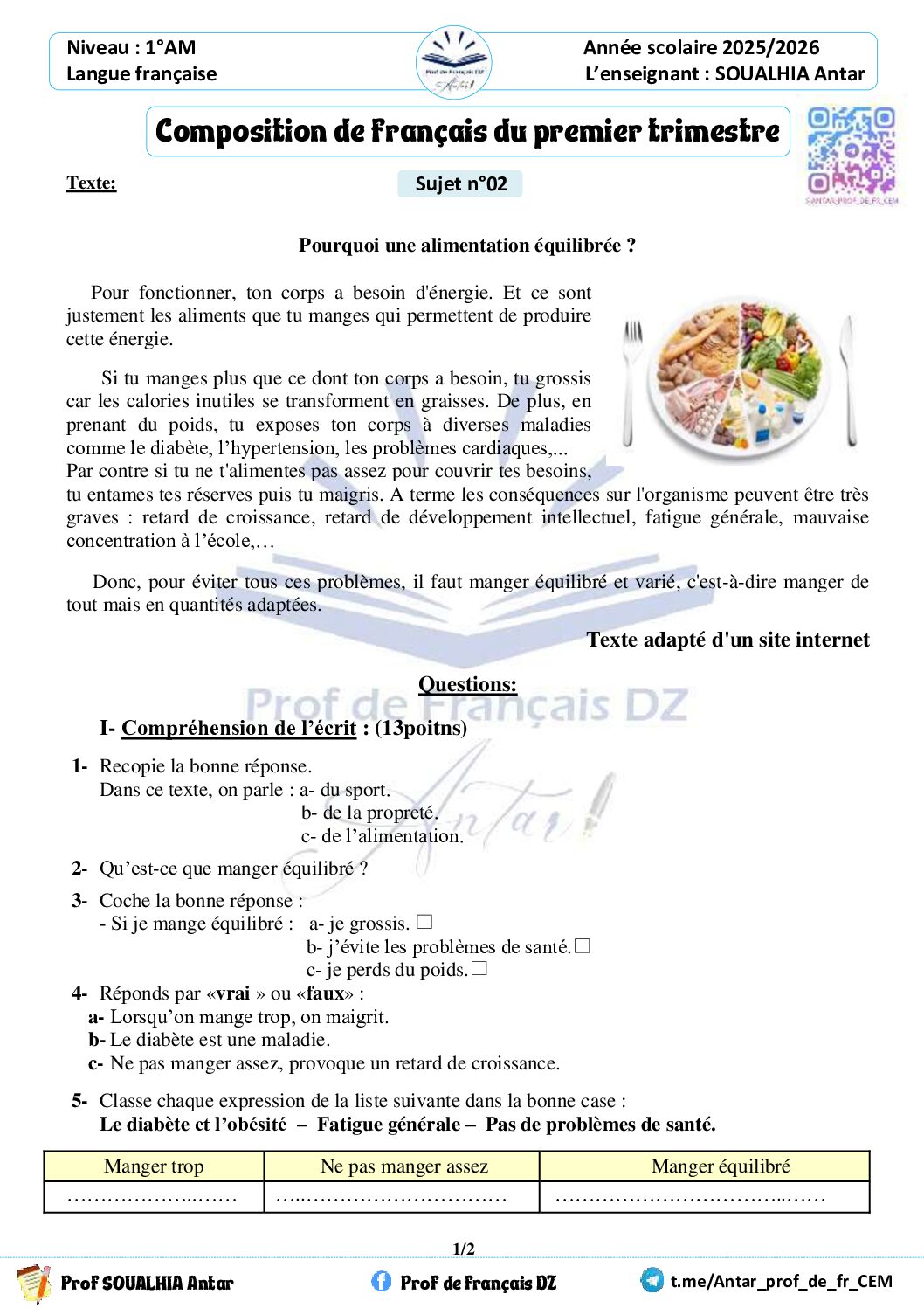 مادة اللغة الفرنسية للسنة الأولى 1 متوسط دروس مفصلة، فروض واختبارات، تمارين محلولة: نموذج لإمتحان في الفصل الأول رقم 72- في مادة اللغة الفرنسية مستوى السنة الأولى متوسط الجيل الثاني ، السنة الدراسية: 2025/2026 مع التصحيح يمكن تصفح الاختبار مباشرة عبر موقع الدراسة الجزائري أو تحميله مباشرة بصيغة PDF بالضغط أعلاه على: .: تحميل :. اللغة الفرنسية السنة الأولى متوسط