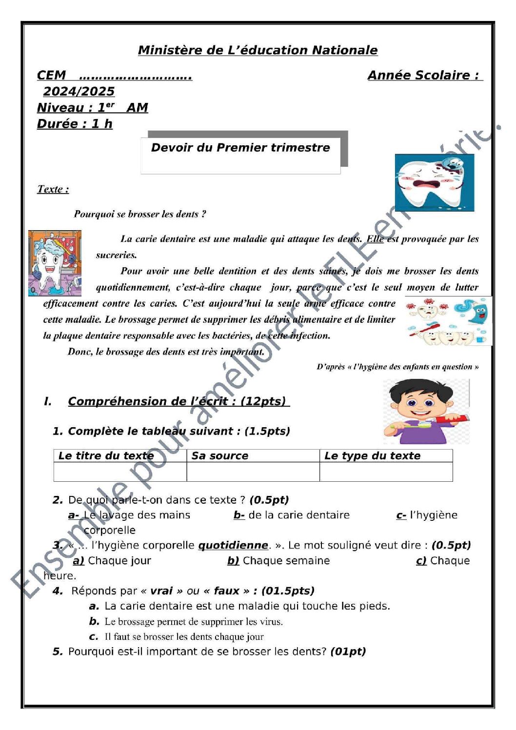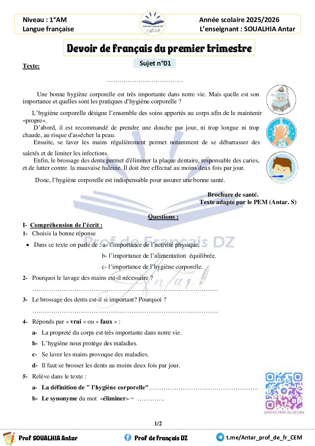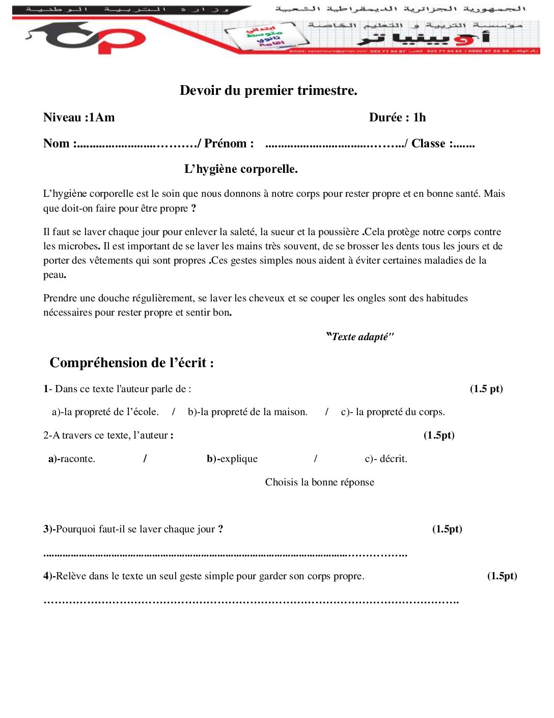 فرض في اللغة الفرنسية الفصل الأول السنة الأولى متوسط رقم 71 مع التصحيح